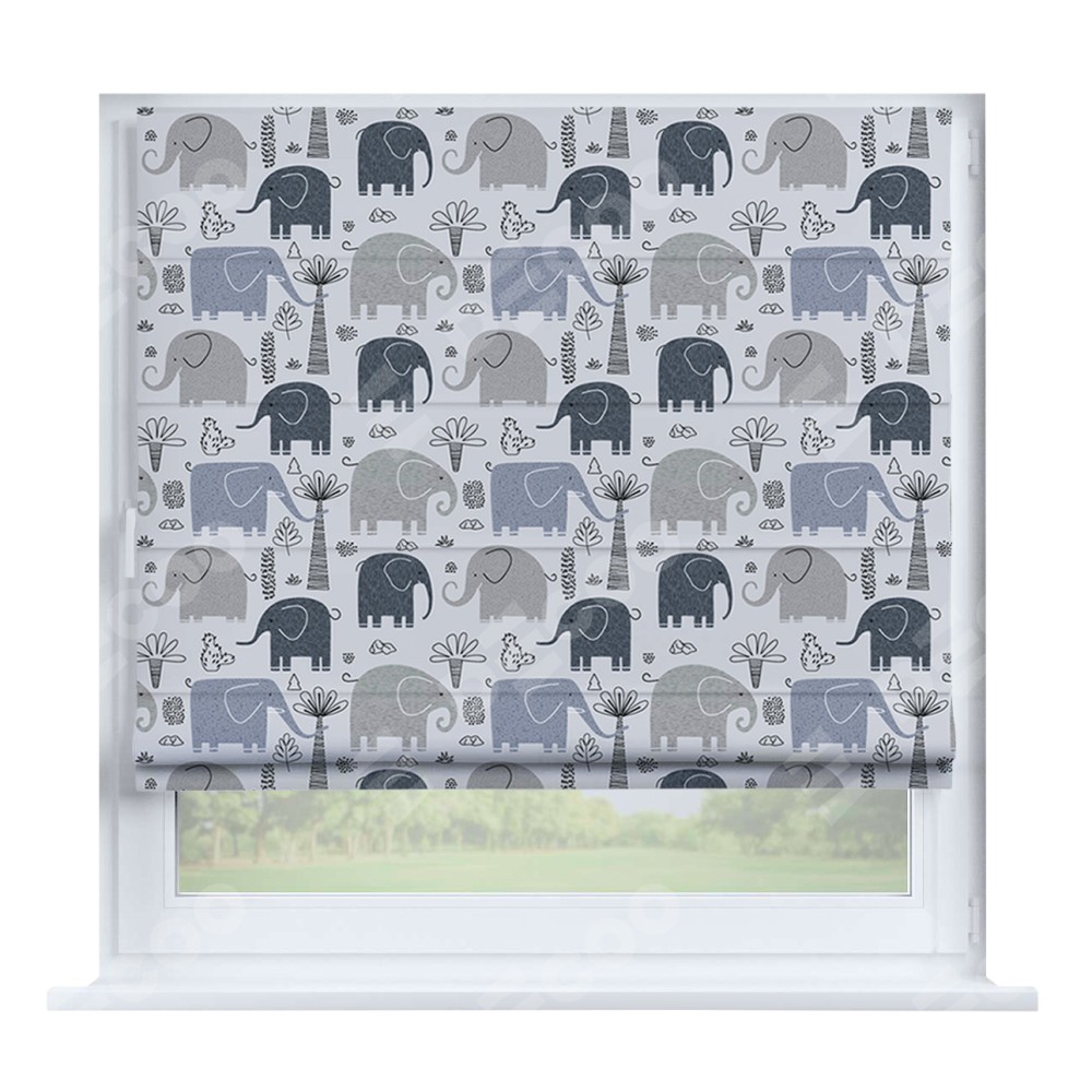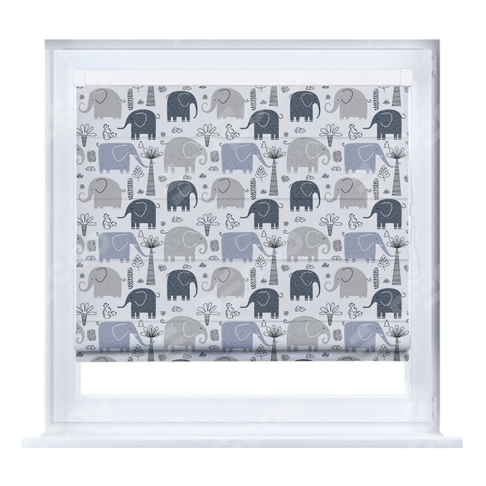 Римская штора производителя «Cortin», устанавливается на створку окна, пошита из ткани блэкаут с нанесением сублимационной печати «Серые слоники». Штора шьётся по индивидуальным размерам, для данного типа римской шторы возможная ширина от 35 до 150 см., высота до 250 см.