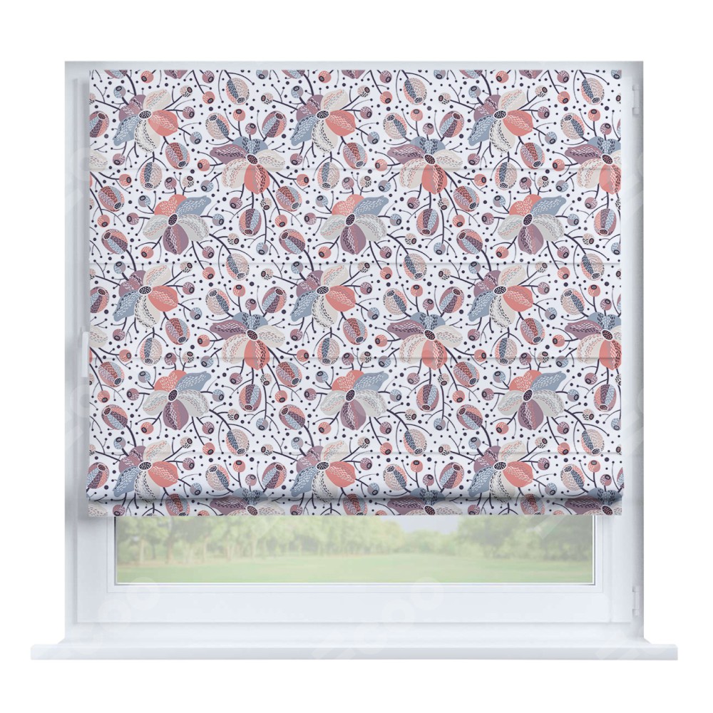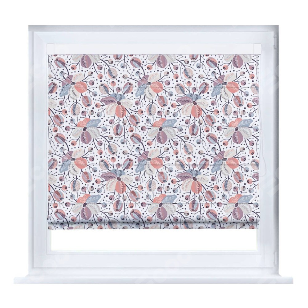Римская штора производителя «Cortin», устанавливается на створку окна, пошита из ткани блэкаут с нанесением сублимационной печати «Цветочный микс». Штора шьётся по индивидуальным размерам, для данного типа римской шторы возможная ширина от 35 до 150 см., высота до 250 см.