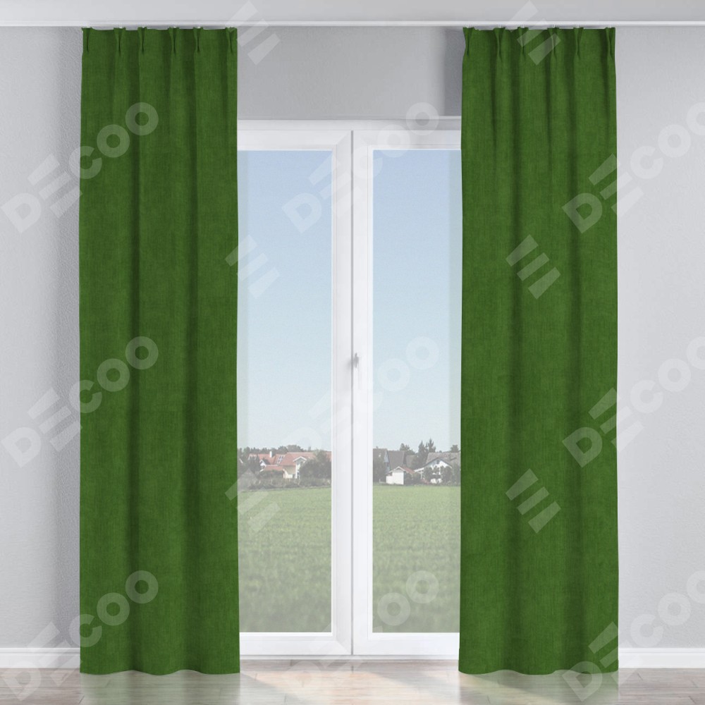 Комплект прямых штор, от производителя «Cortin», пошиты из ткани вельвет тёмно-салатовый, артикул ткани 33805. С изнаночной стороны в верхней части штор пристрачивается шторная лента с декоративными складками «Кустик». Для создания элегантных складок прямые шторы шьются по стандарту с коэффициентом 1:2 (на 100 см. ширины проёма 200 см. ширины ткани).
