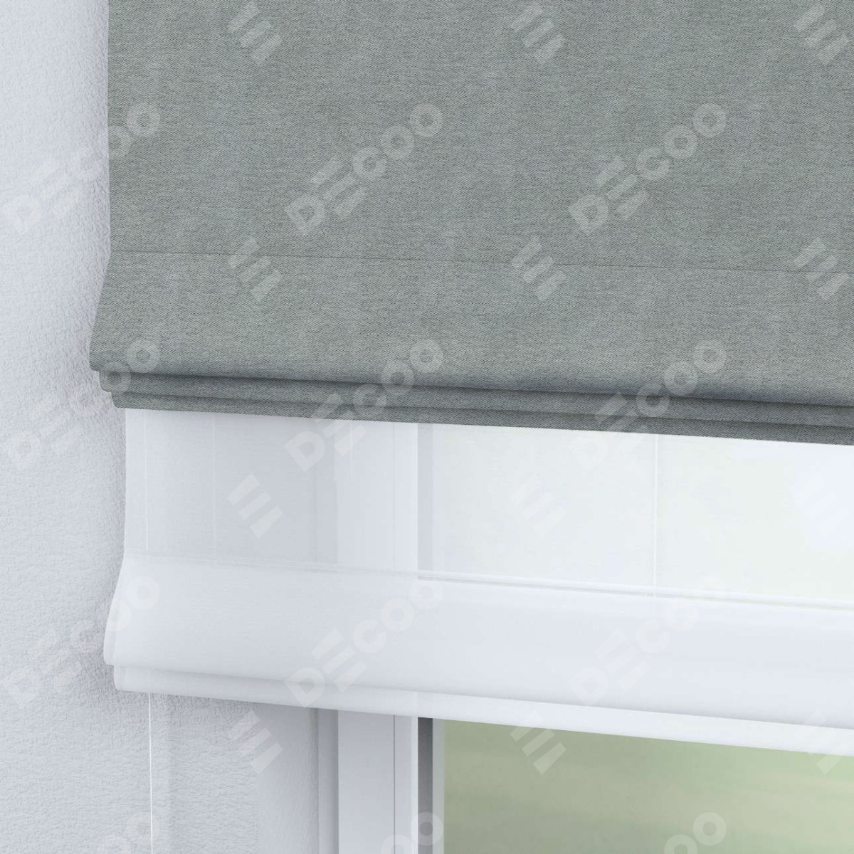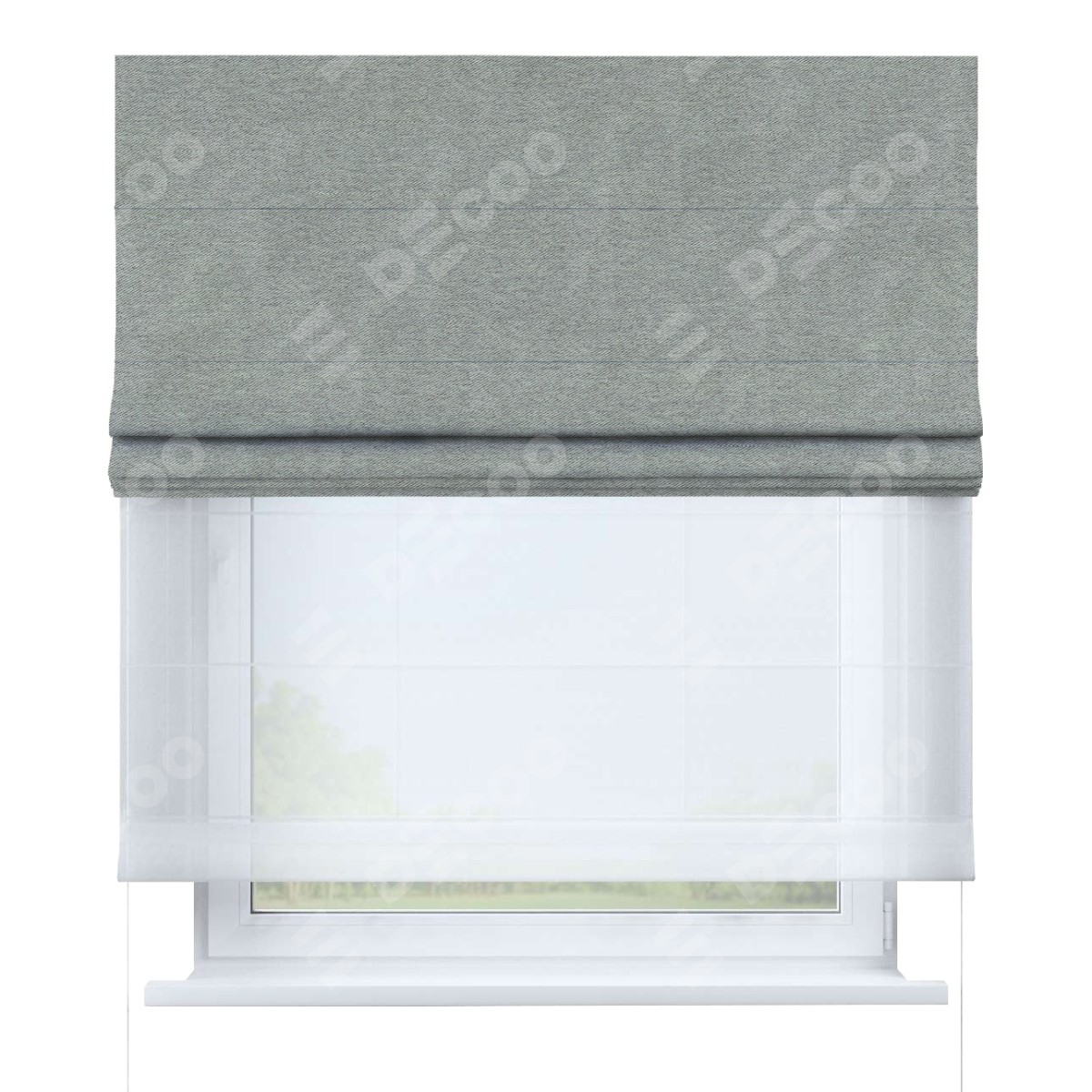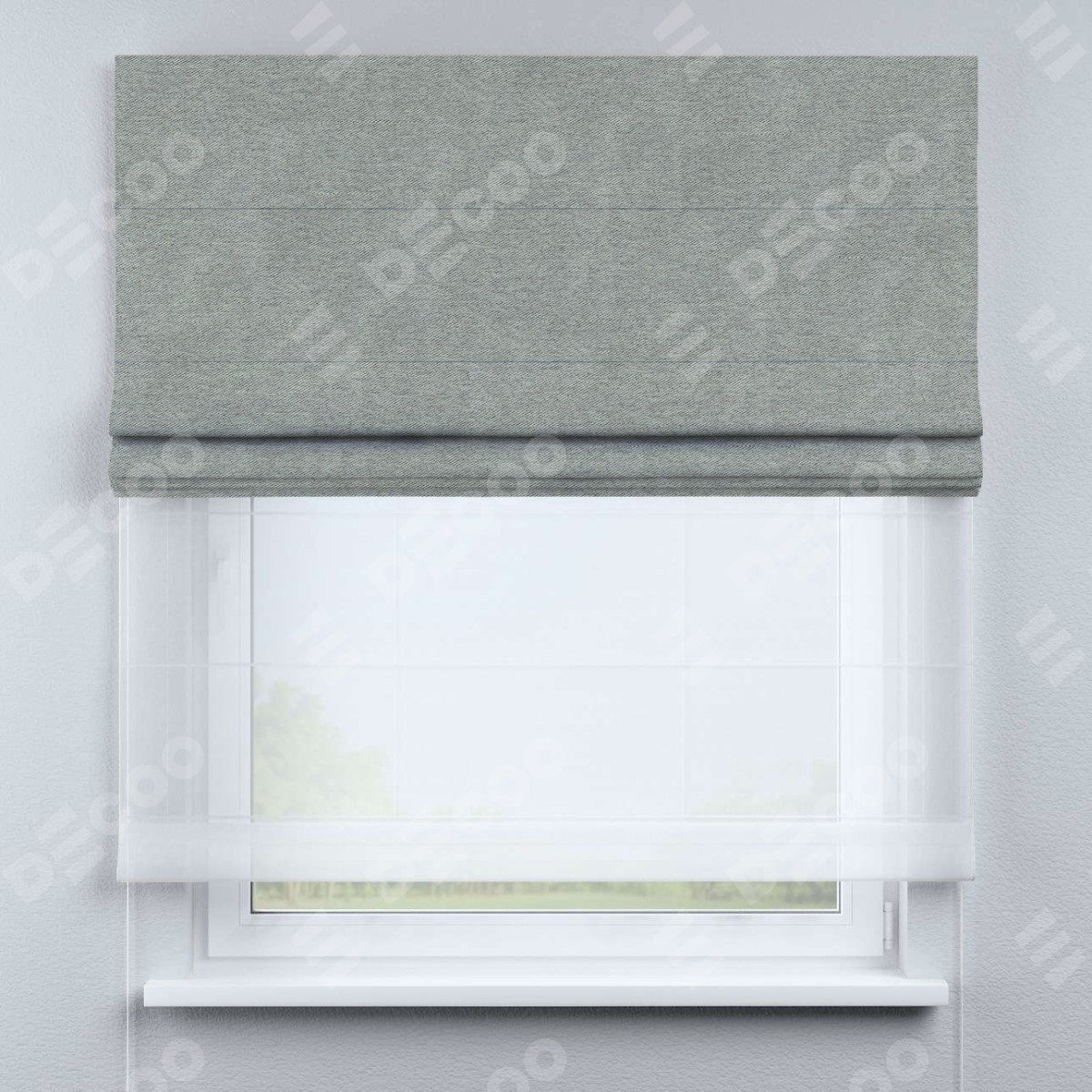 Римская штора день-ночь производителя «Cortin», используется для проёма, пошита из двух полотен, с лицевой стороны твид блэкаут светло-серый артикул 21576, вторая ткань тюль (по стандарту комплектуется тюль белого цвета артикул V-01). Имеет универсальный механизм и подходит для монтажа: на потолок, на стену и в нишу.