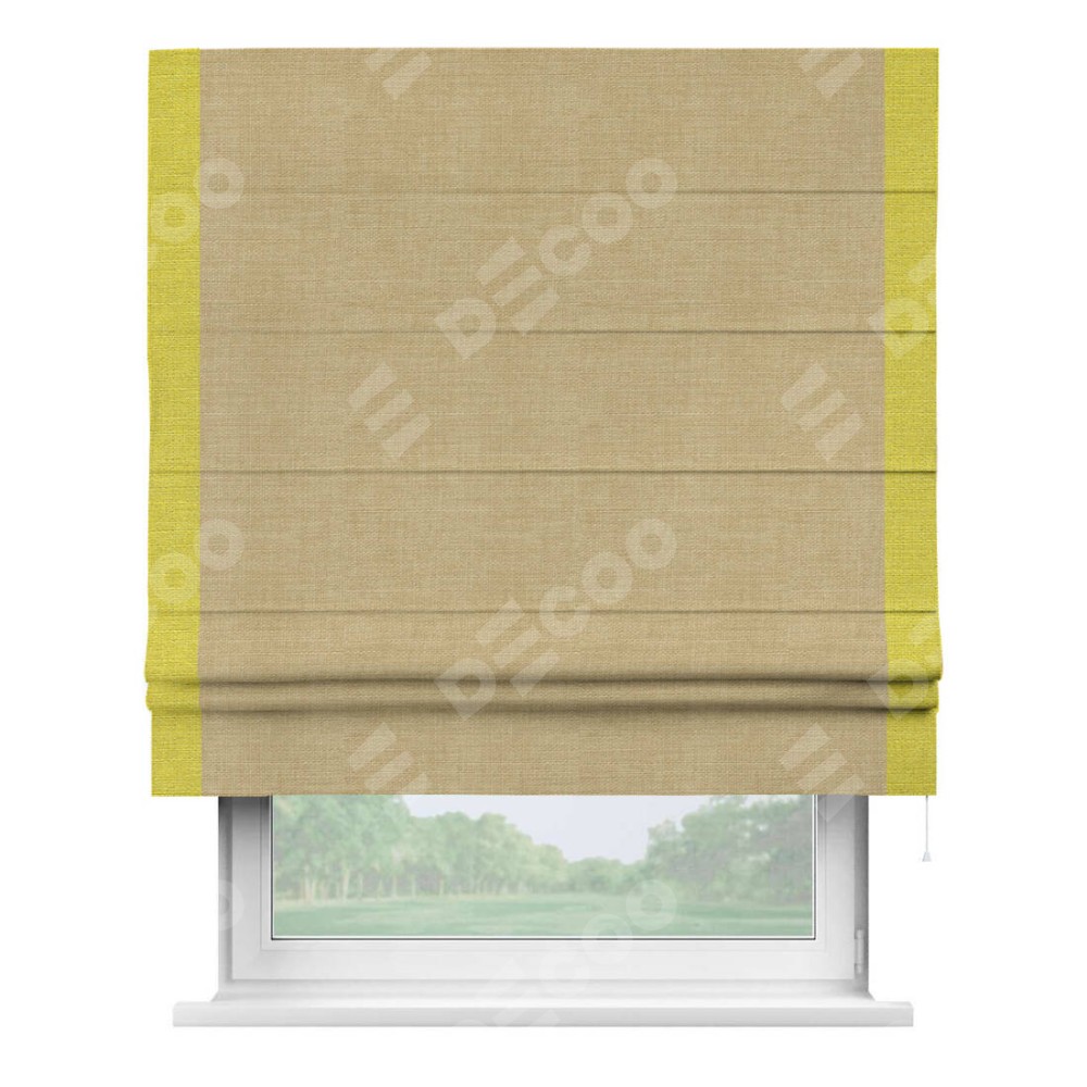 Римская штора производителя «Cortin», используется для проёма, пошита из ткани лён бежевый, артикул 7442. Отделка шторы кантом «Стрим Дуо», ткань для канта используется из льна разной расцветки на выбор. Имеет универсальный механизм и подходит для монтажа: на потолок, на стену и в нишу.