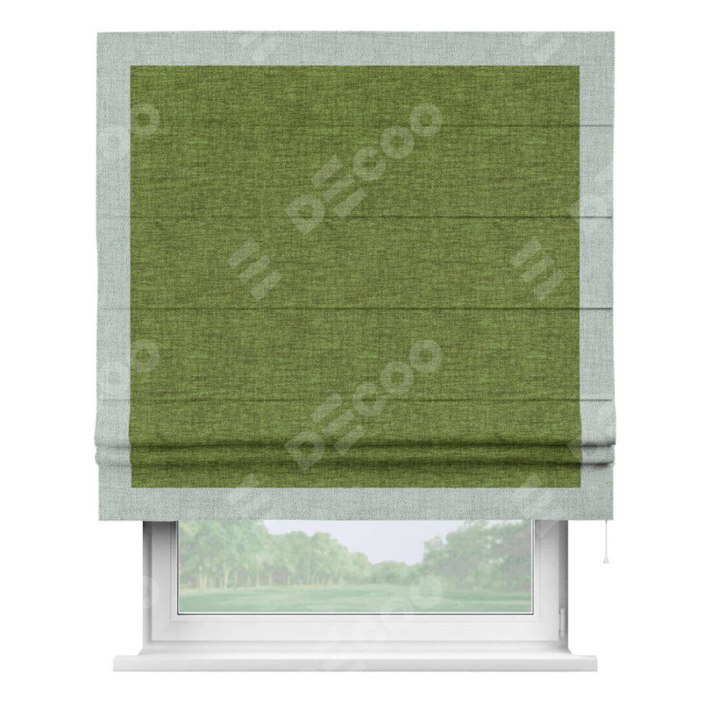 Римская штора производителя «Cortin», используется для проёма, пошита из ткани рогожка димаут салатовый, артикул 80423. Отделка шторы кантом «Чесс», ткань для канта используется из рогожки димаут разной расцветки на выбор. Имеет универсальный механизм и подходит для монтажа: на потолок, на стену и в нишу.