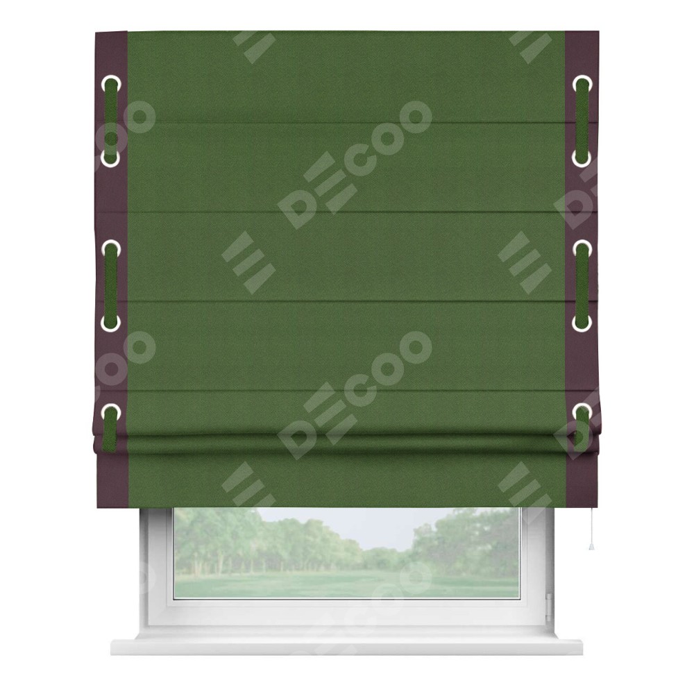 Римская штора производителя «Cortin», используется для проёма, пошита из ткани блэкаут однотонный зелёный перламутр, артикул ткани 81859−2. Отделка шторы кантом «Стрим Дуо» на кантах расположены люверсы с пояском, ткань для канта используется из блэкаута однотонного разной расцветки на выбор. Ткань для пояска обычно используется из основной ткани шторы, а так же можно сделать из любой расцветки по желанию. Имеет универсальный механизм и подходит для монтажа: на потолок, на стену и в нишу.