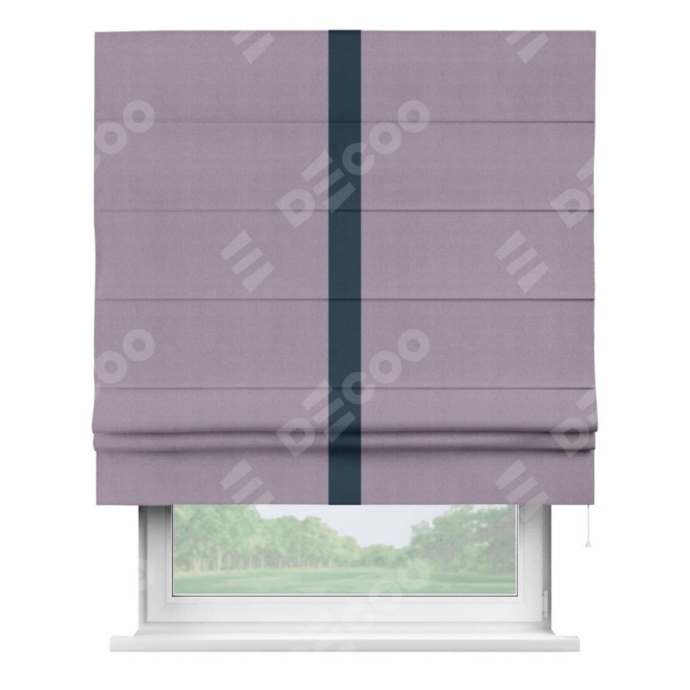 Римская штора производителя «Cortin», используется для проёма, пошита из ткани блэкаут однотонный светло-сиреневый, артикул ткани 29333−1. Отделка шторы кантом «Хайвей», ткань для канта используется из блэкаута однотонного разной расцветки на выбор. Имеет универсальный механизм и подходит для монтажа: на потолок, на стену и в нишу.