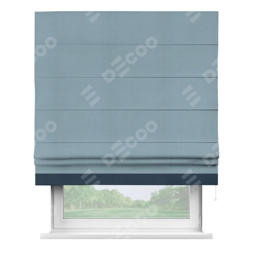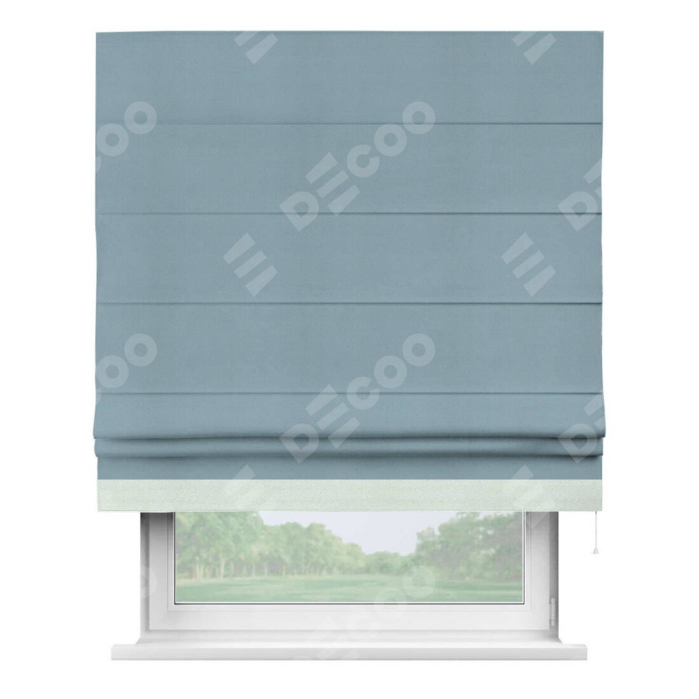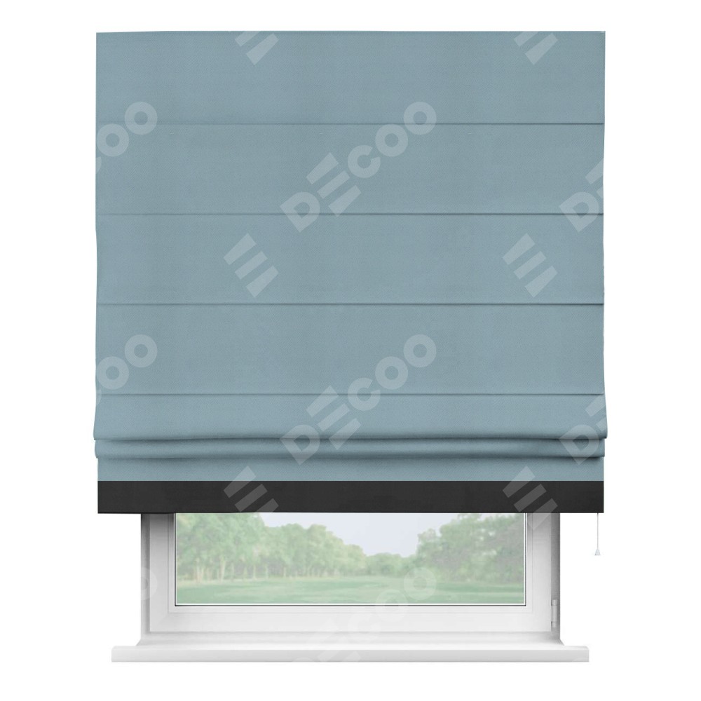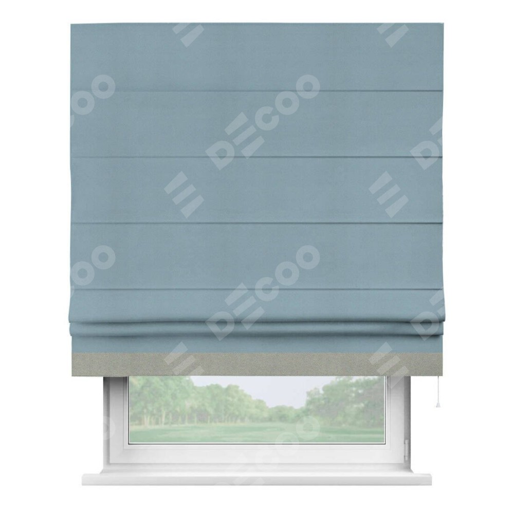 Римская штора производителя «Cortin», используется для проёма, пошита из ткани блэкаут однотонный серо-голубой, артикул ткани 29327−2. Отделка шторы кантом «Джестер», ткань для канта используется из блэкаута однотонного разной расцветки на выбор. Имеет универсальный механизм и подходит для монтажа: на потолок, на стену и в нишу.