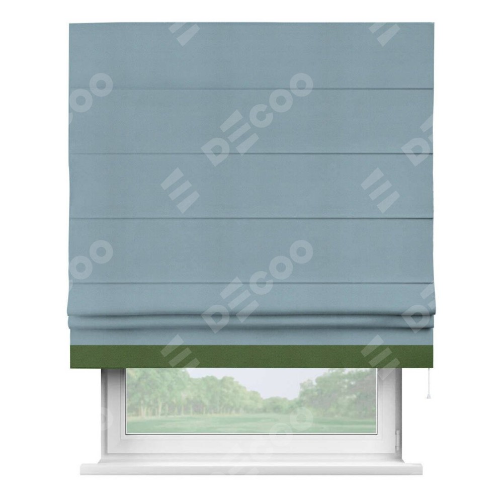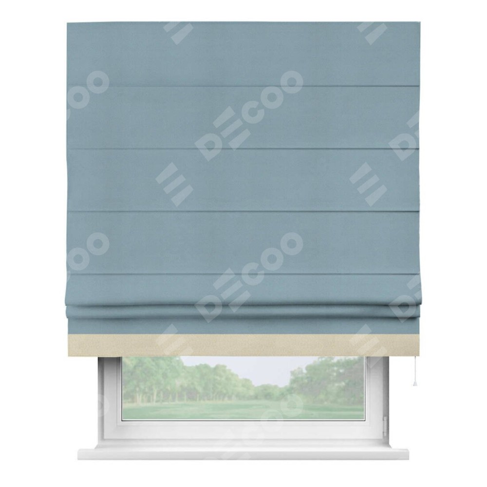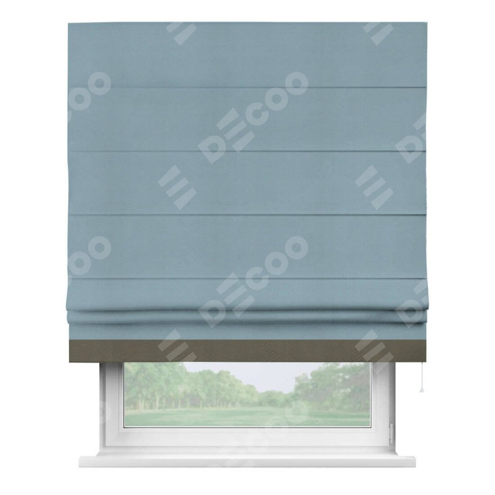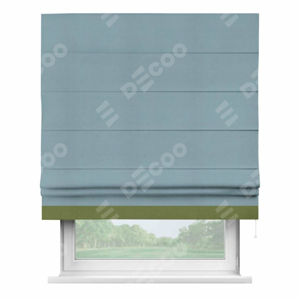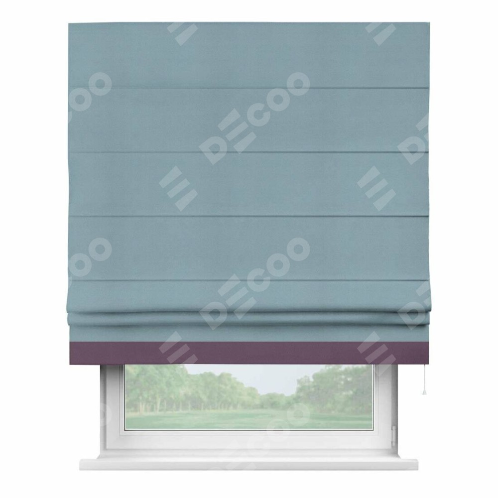 Римская штора производителя «Cortin», используется для проёма, пошита из ткани блэкаут однотонный серо-голубой, артикул ткани 29327−2. Отделка шторы кантом «Джестер», ткань для канта используется из блэкаута однотонного разной расцветки на выбор. Имеет универсальный механизм и подходит для монтажа: на потолок, на стену и в нишу.