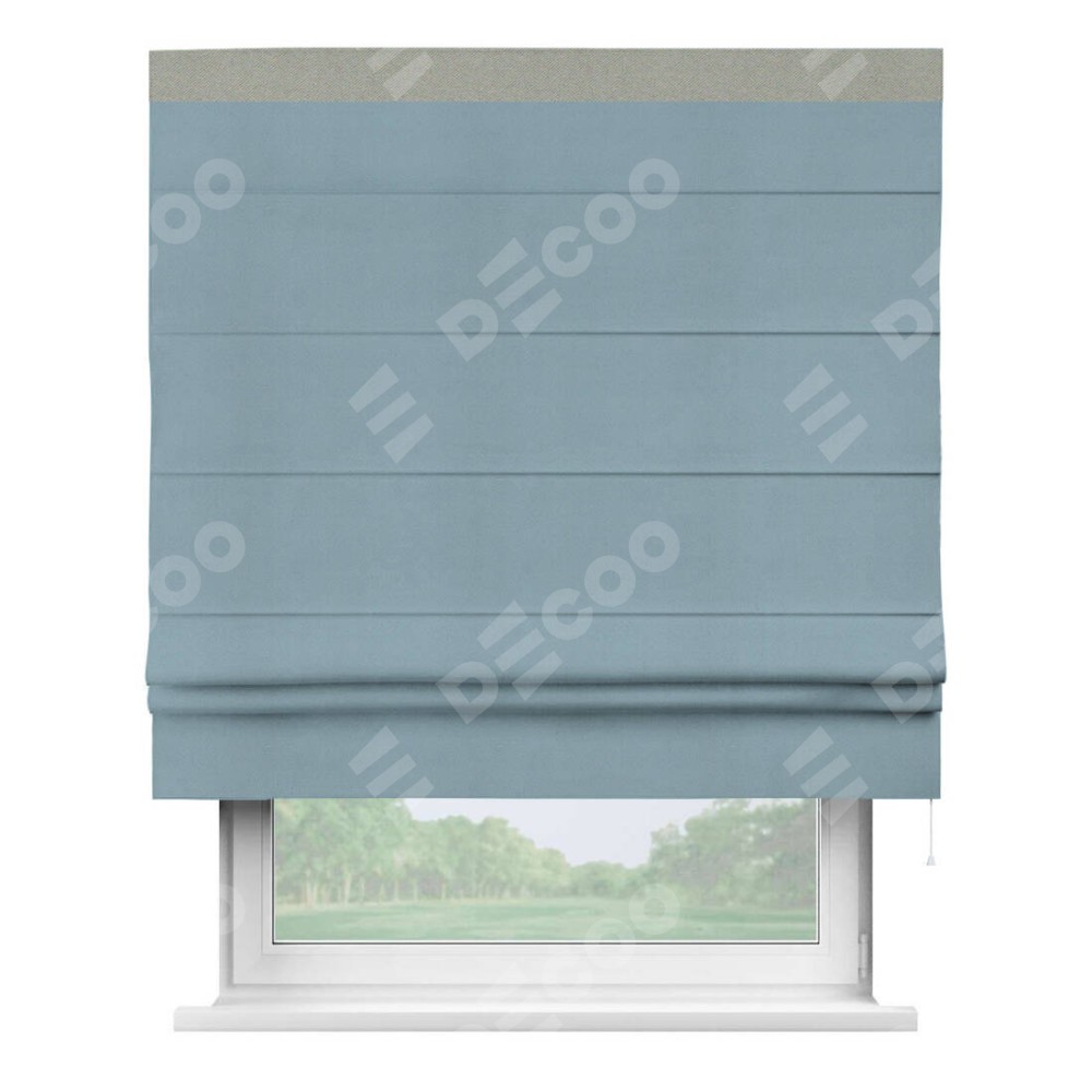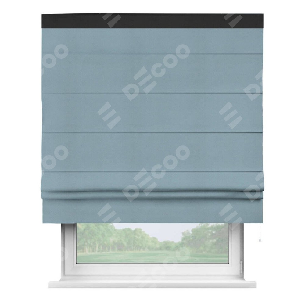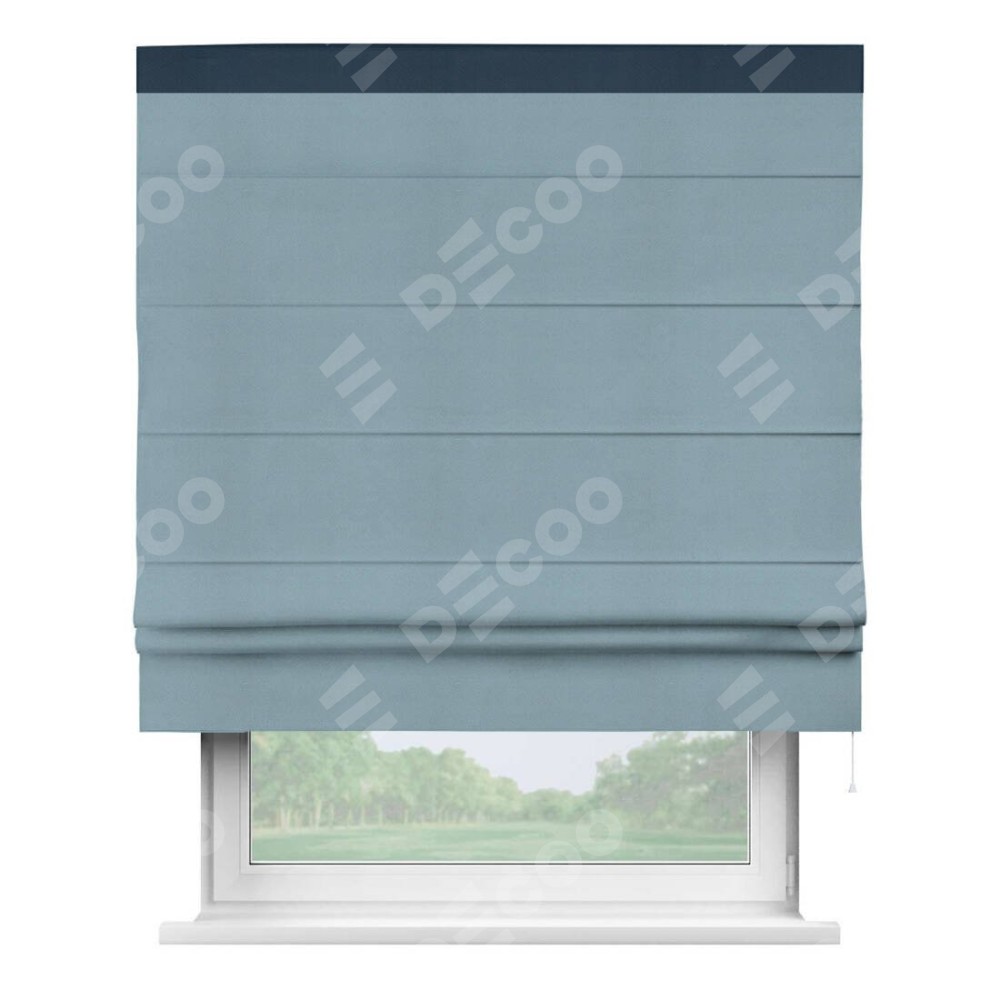 Римская штора производителя «Cortin», используется для проёма, пошита из ткани блэкаут однотонный серо-голубой, артикул ткани 29327−2. Отделка шторы кантом «Кинг», ткань для канта используется из блэкаута однотонного разной расцветки на выбор. Имеет универсальный механизм и подходит для монтажа: на потолок, на стену и в нишу.