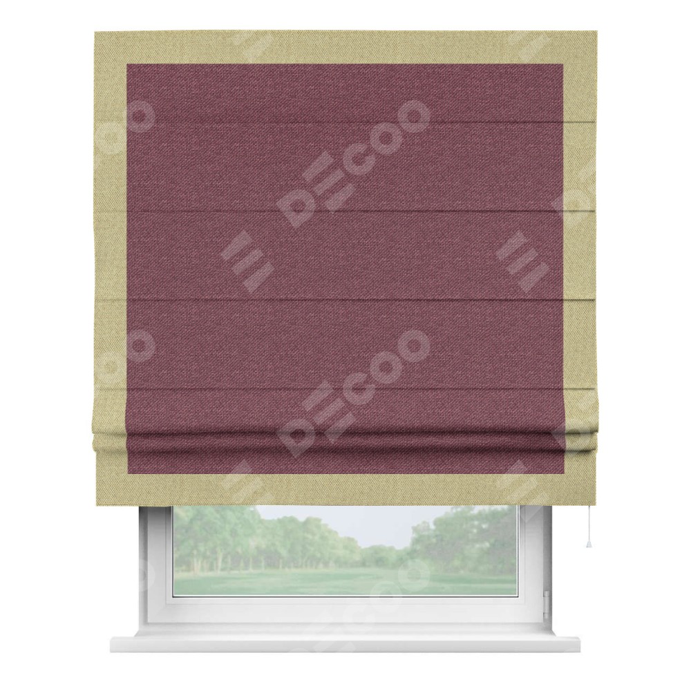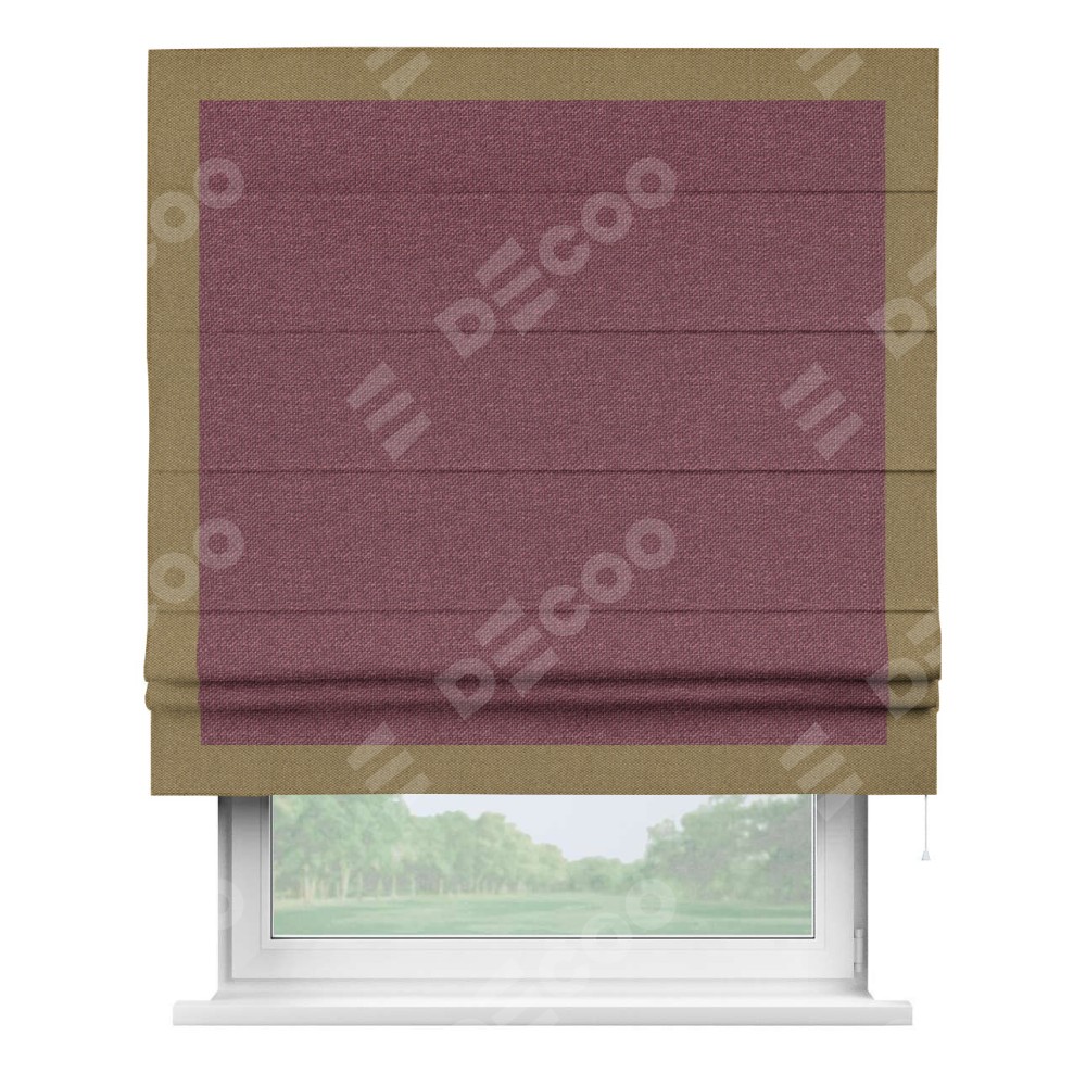 Римская штора производителя «Cortin», используется для проёма, пошита из ткани лён димаут марсала, артикул 1602. Отделка шторы кантом «Чесс», ткань для канта используется из льна димаут разной расцветки на выбор. Имеет универсальный механизм и подходит для монтажа: на потолок, на стену и в нишу.