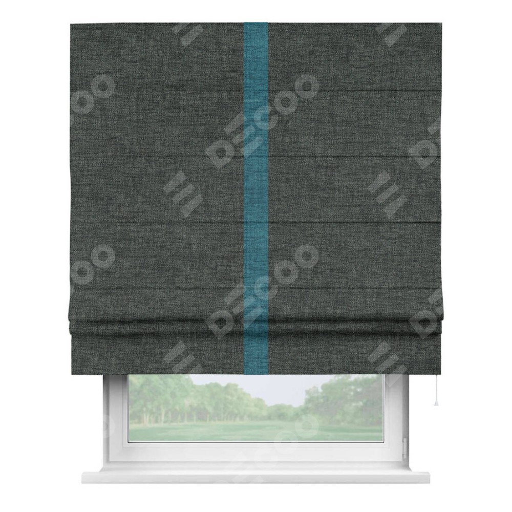 Римская штора производителя «Cortin», используется для проёма, пошита из ткани рогожка димаут графит, артикул 102−34. Отделка шторы кантом «Хайвэй», ткань для канта используется из рогожки димаут разной расцветки на выбор. Имеет универсальный механизм и подходит для монтажа: на потолок, на стену и в нишу.