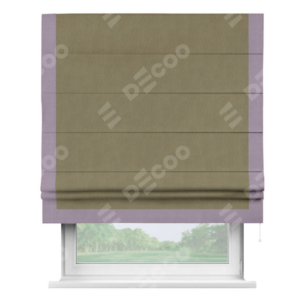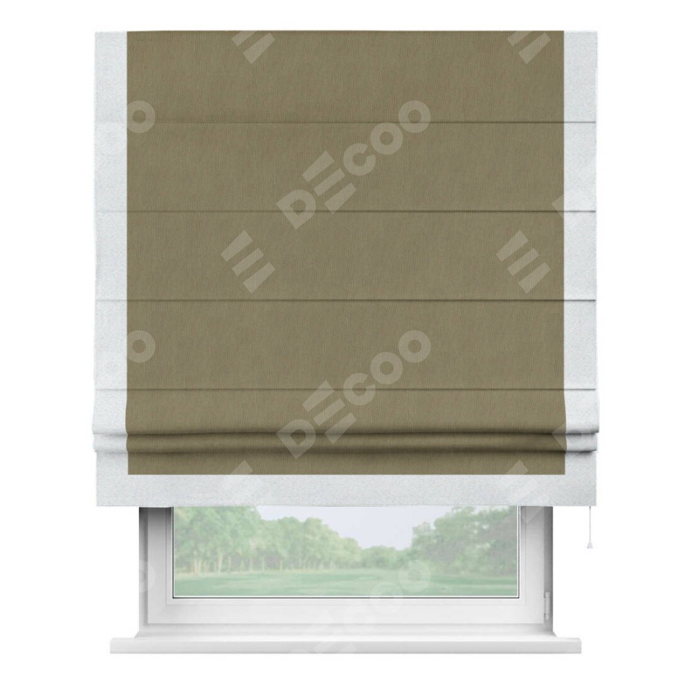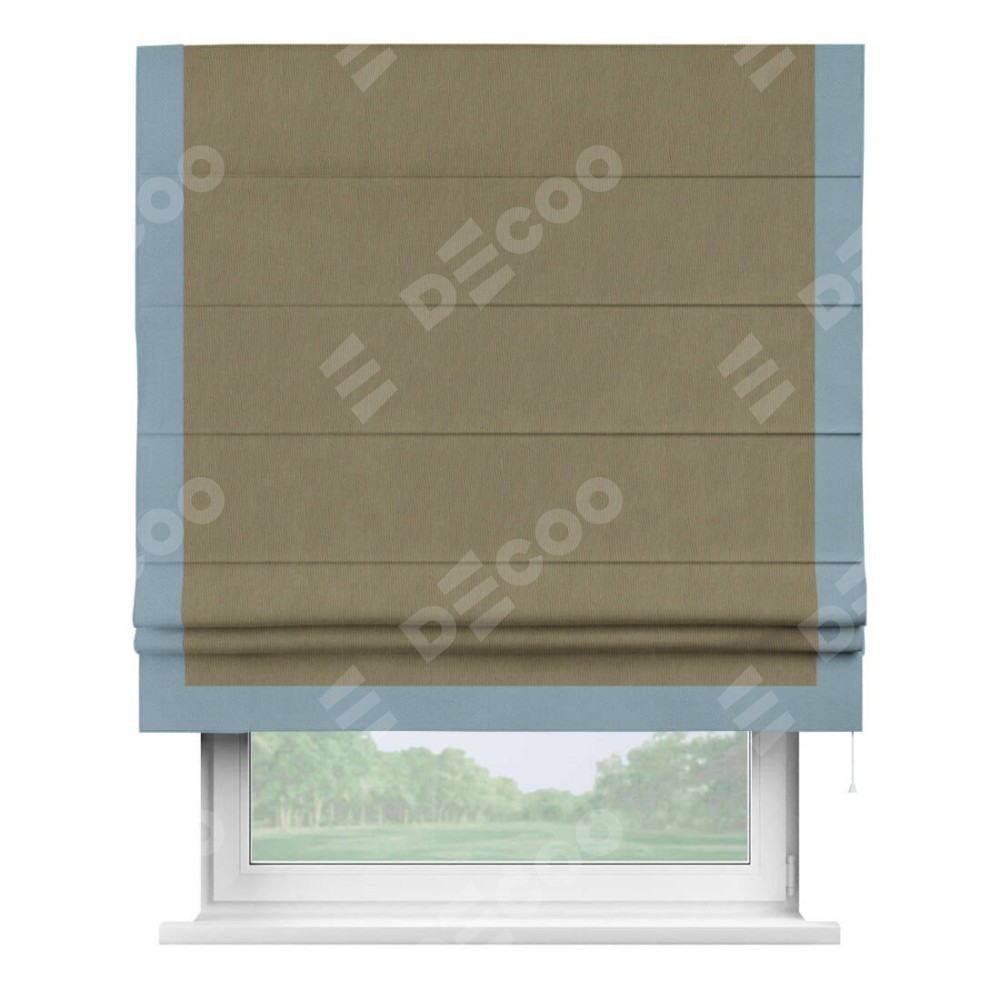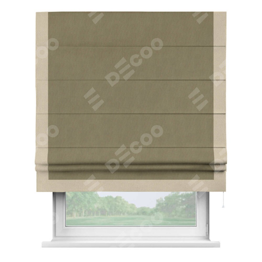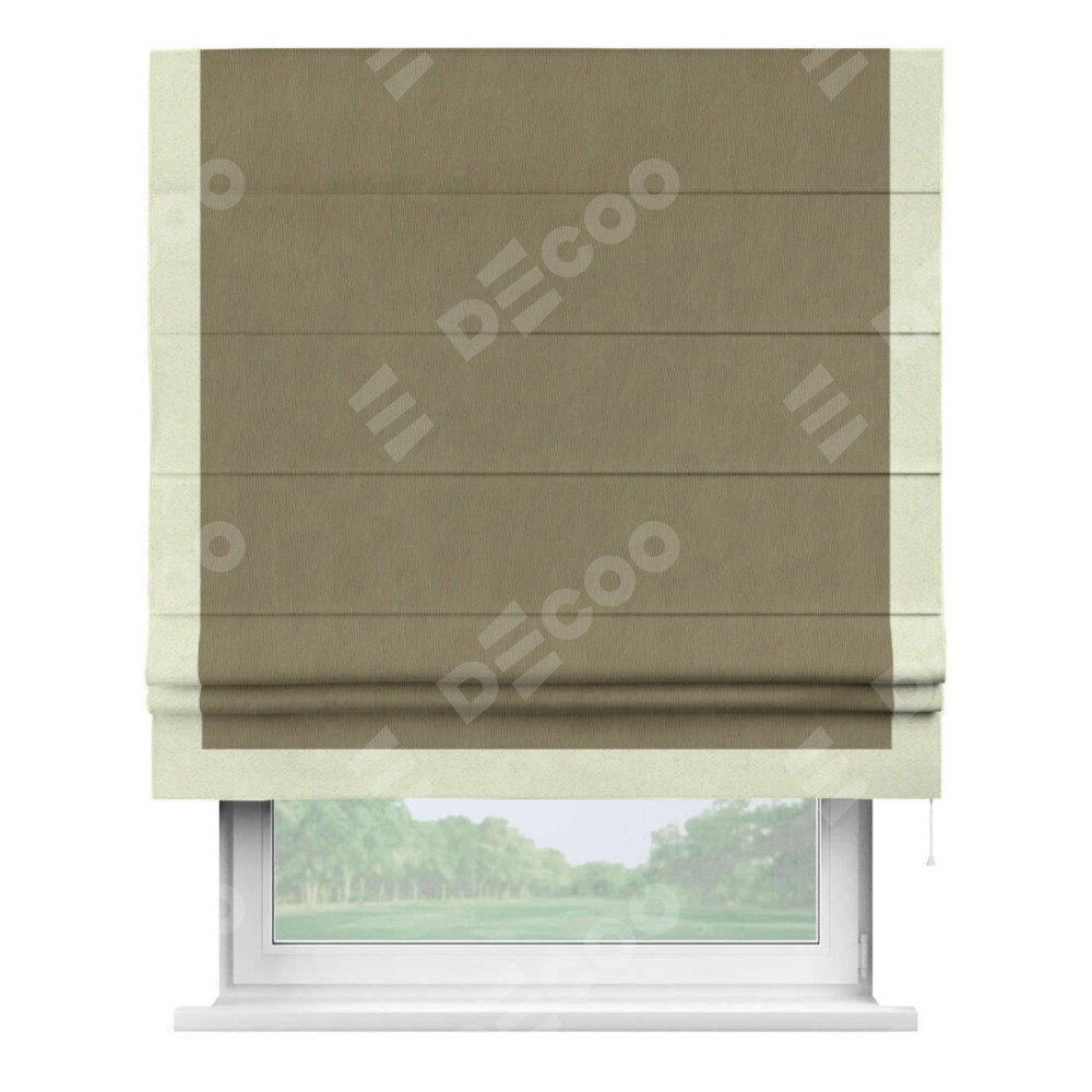 Римская штора производителя «Cortin», используется для проёма, пошита из ткани блэкаут однотонный бежево-золотой, артикул ткани 12095−2. Отделка шторы кантом «Виктория», ткань для канта используется из блэкаута однотонного разной расцветки на выбор. Имеет универсальный механизм и подходит для монтажа: на потолок, на стену и в нишу.