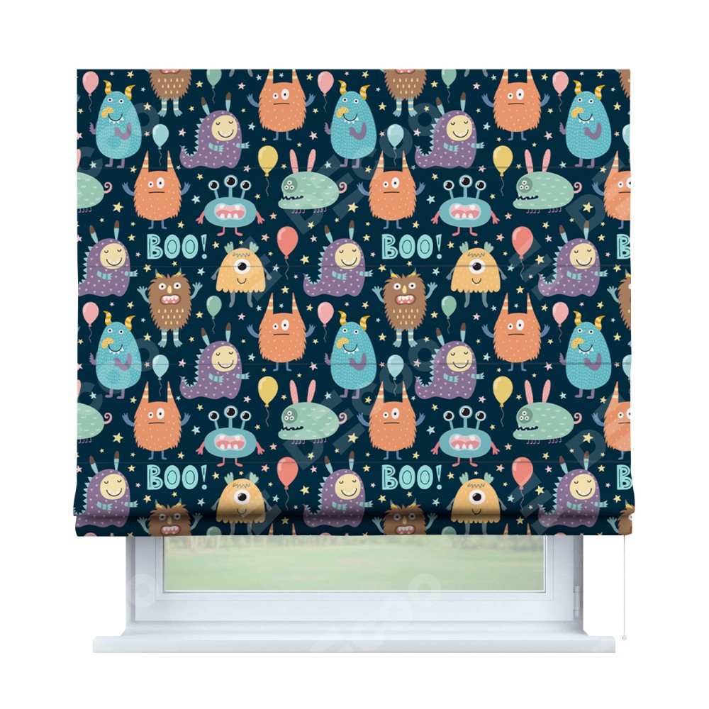 Римская штора производителя «Cortin», используется для проёма, пошита из ткани блэкаут с нанесением сублимационной печати «Звёздные страшилки». Имеет универсальный механизм и подходит для монтажа: на потолок, на стену и в нишу.