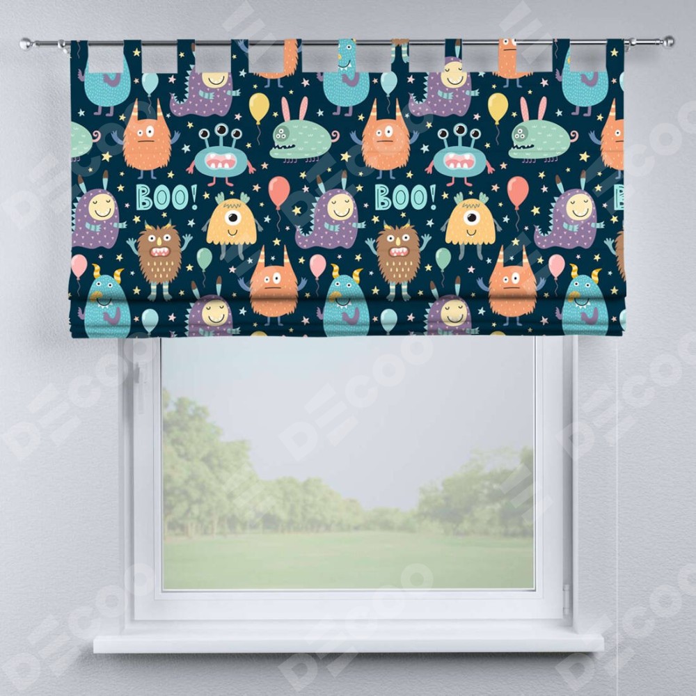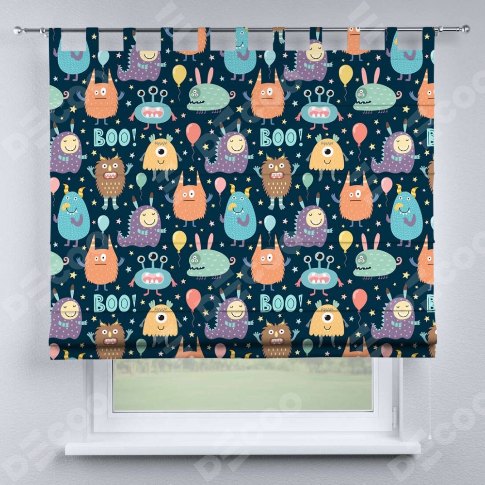 Римская штора производителя «Cortin», используется для проёма, пошита из ткани блэкаут с нанесением сублимационной печати «Звёздные страшилки». Данная модель пошита на петлях, комплектуется на выбор круглым карнизом и подходит для монтажа на стену. Римская штора на петлях имеет простую систему регулировки высоты, отличительным преимуществом данной модели является простой способ монтажа. Достаточно повесить ее на трубу и штора готова!