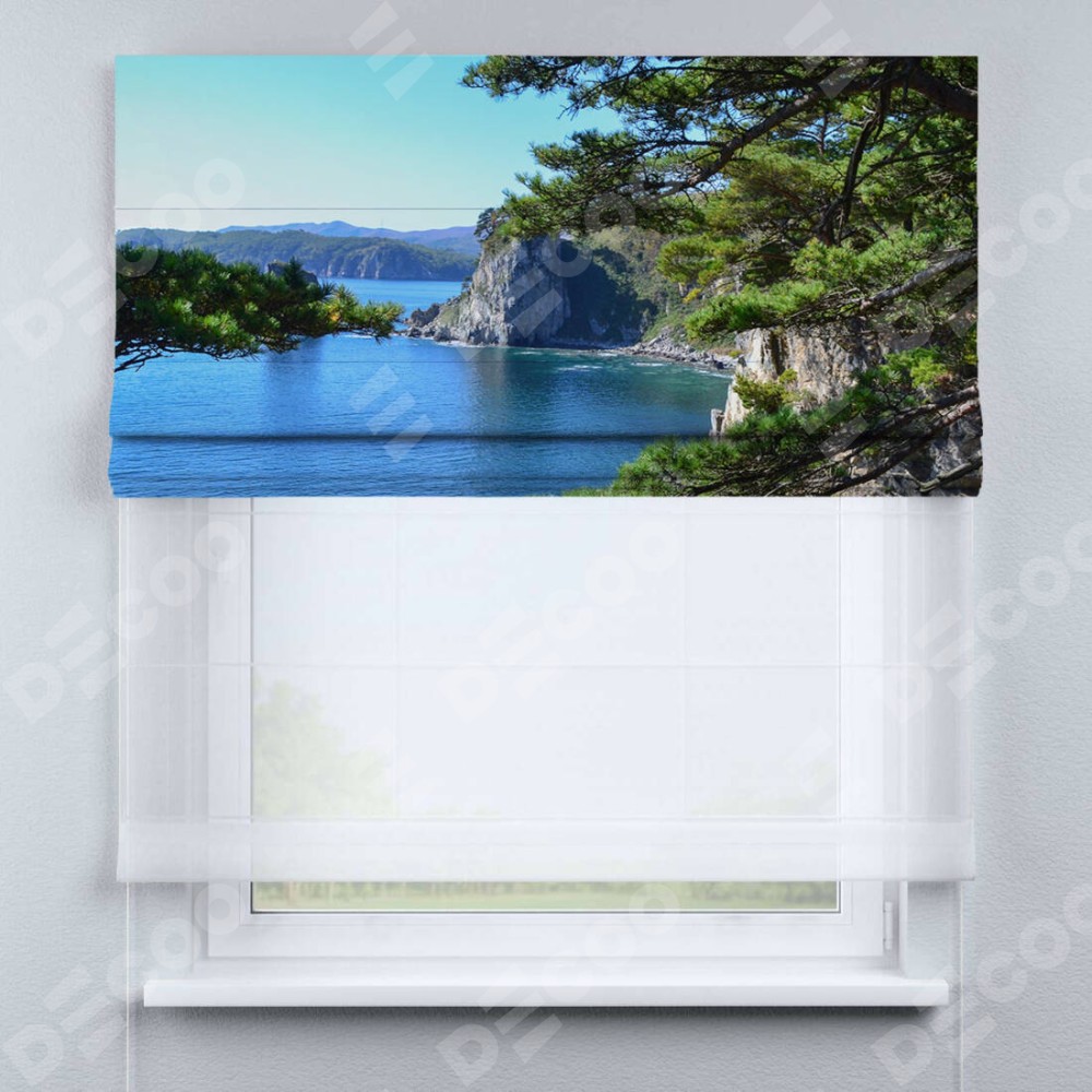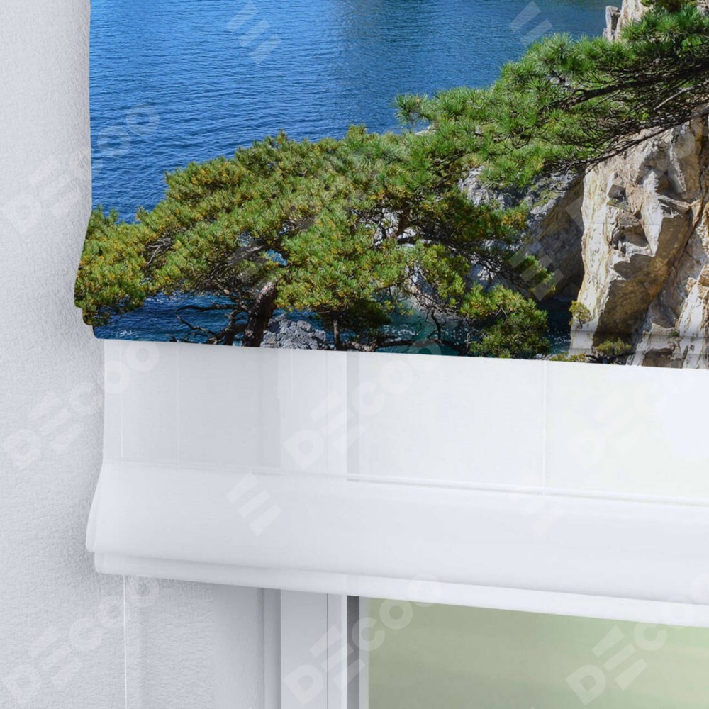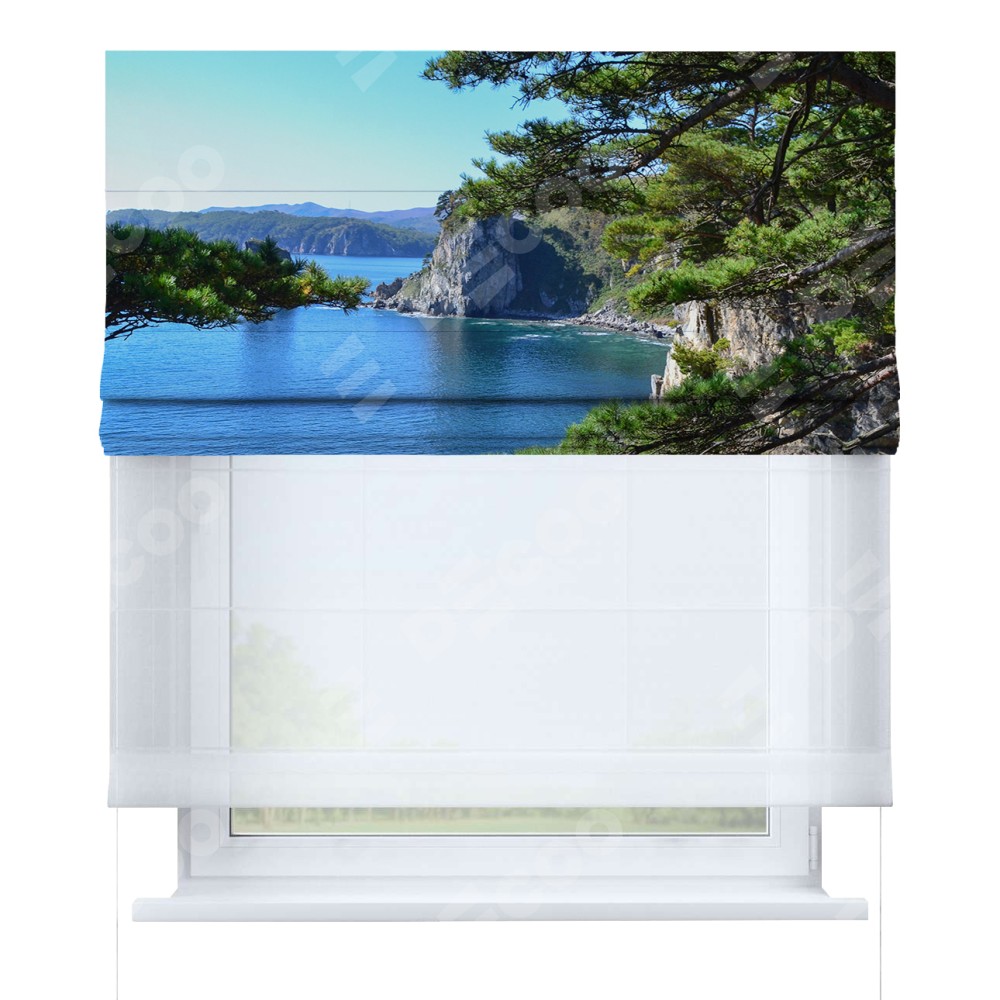 Римская штора день-ночь производителя «Cortin», используется для проёма, пошита из двух полотен, с лицевой блэкаут с нанесением сублимационной печати «Море и сосны», вторая ткань тюль (по стандарту комплектуется тюль белого цвета артикул V-01). Имеет универсальный механизм и подходит для монтажа: на потолок, на стену и в нишу.