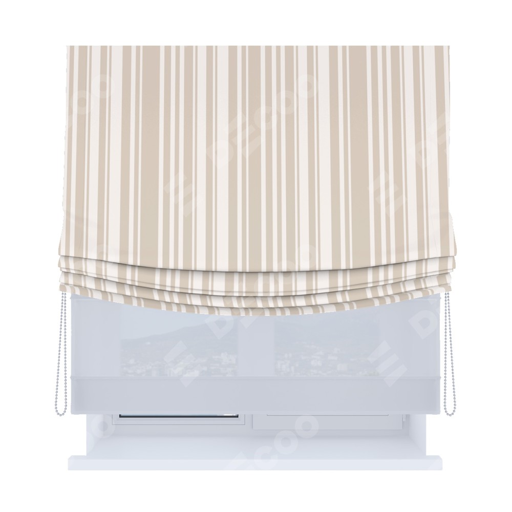Римская штора день-ночь производителя «Cortin», используется для проёма, пошита из двух полотен, с лицевой блэкаут с нанесением сублимационной печати «Бежевые вертикальные полоски», вторая ткань тюль (по стандарту комплектуется тюль белого цвета артикул V-01). Имеет универсальный механизм и подходит для монтажа: на потолок, на стену и в нишу. Удобное управление каждой шторой отдельно.