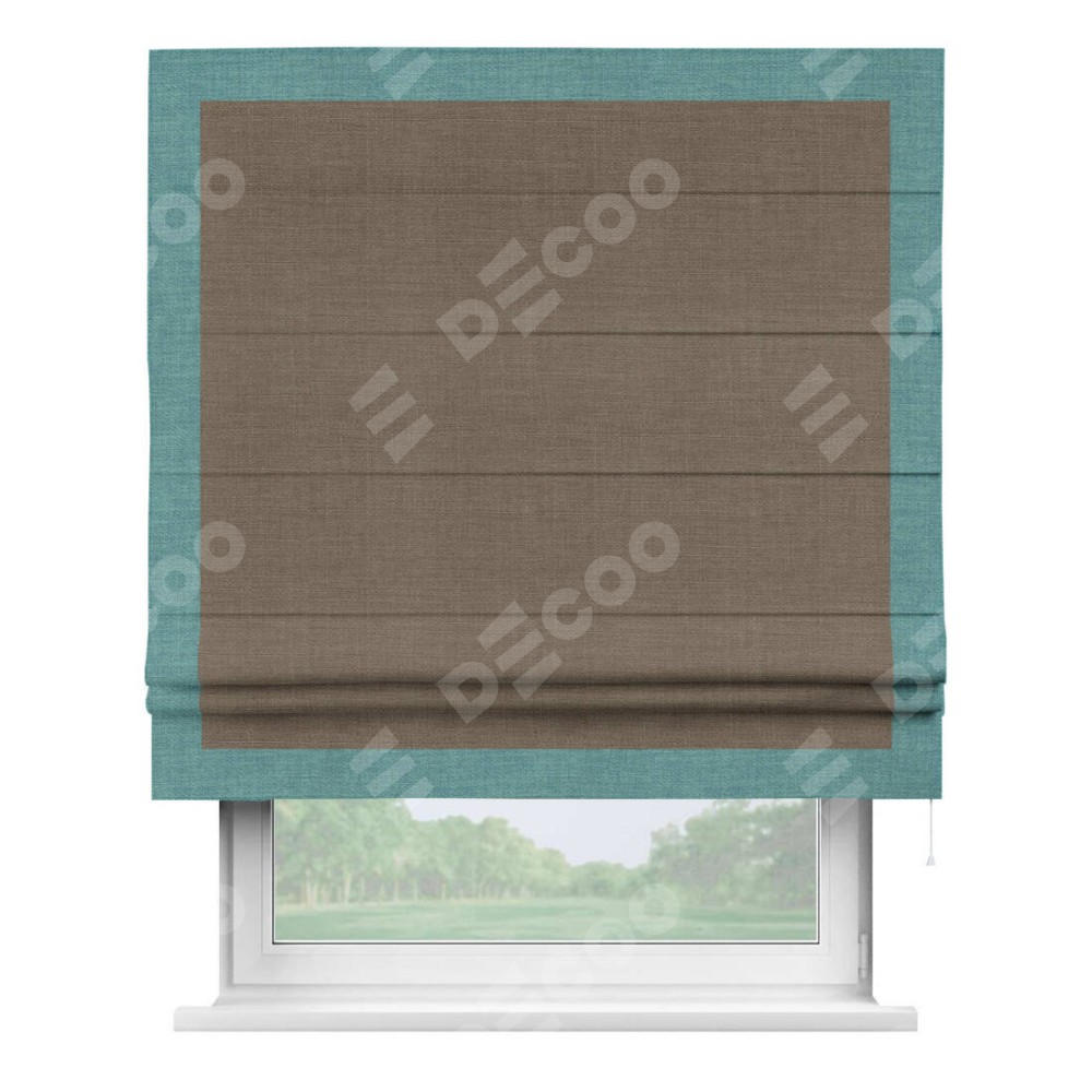 Римская штора производителя «Cortin», используется для проёма, пошита из ткани лён мокко, артикул 7444. Отделка шторы кантом «Чесс», ткань для канта используется из льна разной расцветки на выбор. Имеет универсальный механизм и подходит для монтажа: на потолок, на стену и в нишу.