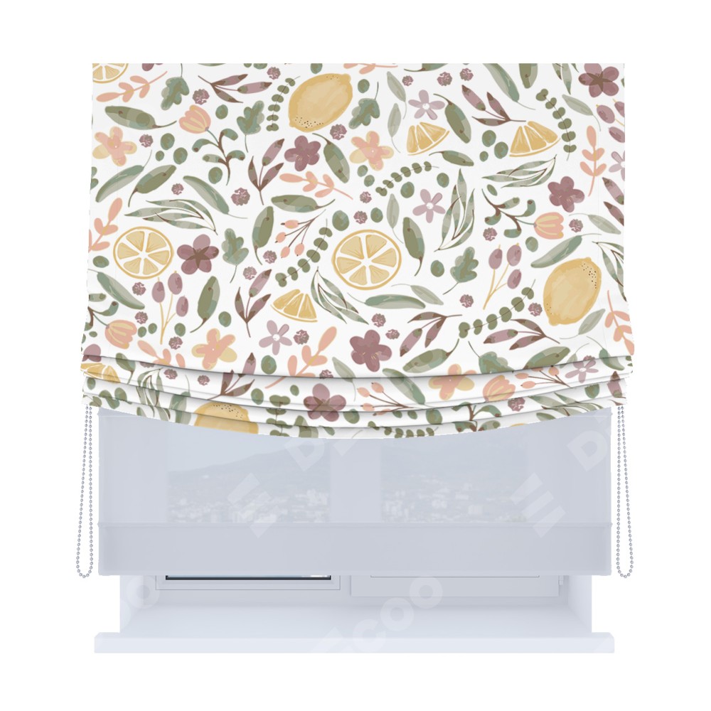 Римская штора «Кортин», день-ночь с мягкими складками, «Лимоны и цветы»