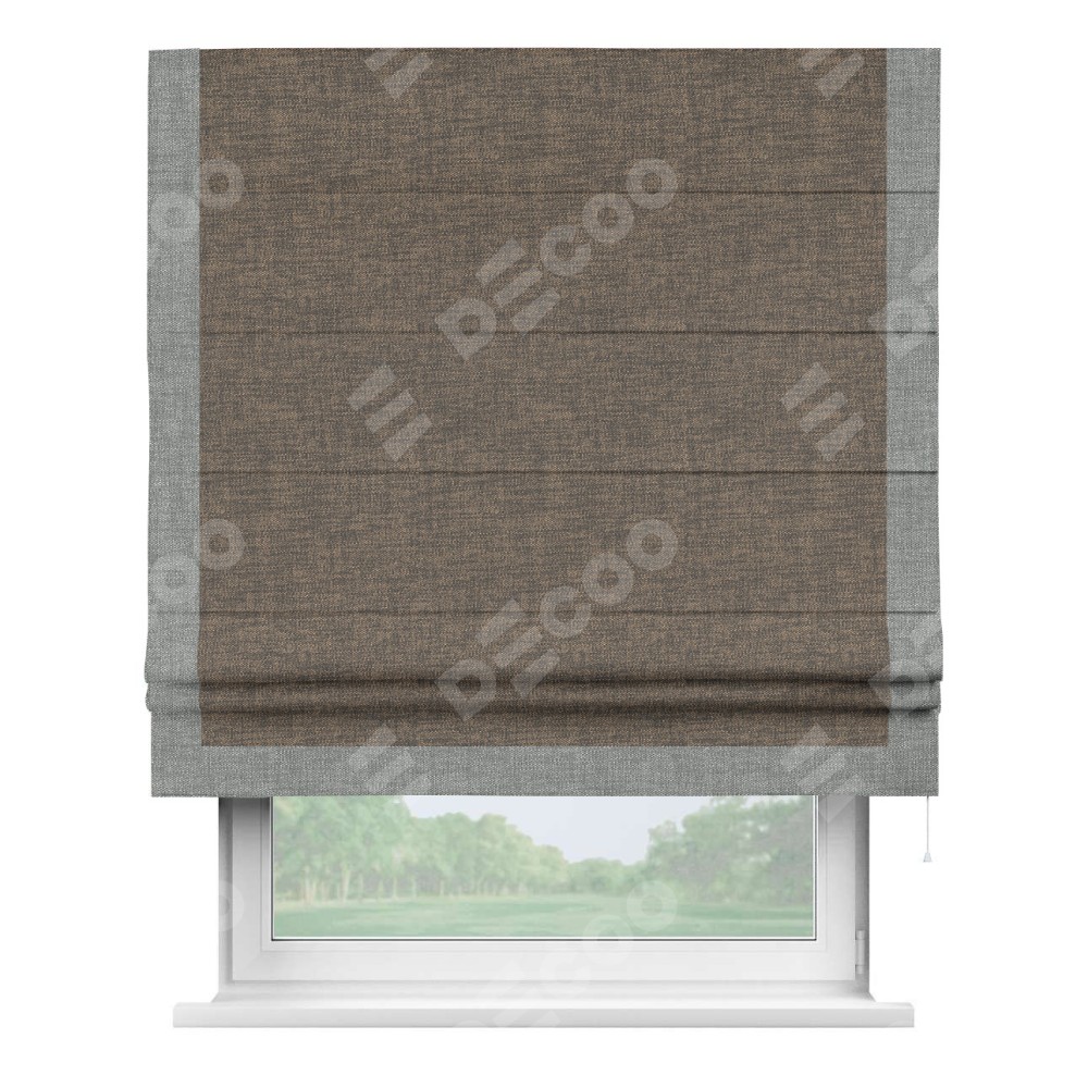 Римская штора производителя «Cortin», используется для проёма, пошита из ткани рогожка димаут коричневый, артикул 80420. Отделка шторы кантом «Виктория», ткань для канта используется из рогожки димаут разной расцветки на выбор. Имеет универсальный механизм и подходит для монтажа: на потолок, на стену и в нишу.