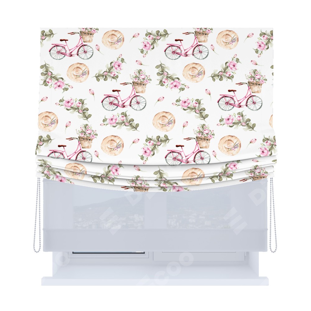 Римская штора день-ночь производителя «Cortin», используется для проёма, пошита из двух полотен, с лицевой блэкаут с нанесением сублимационной печати «Розовый велосипед», вторая ткань тюль (по стандарту комплектуется тюль белого цвета артикул V-01). Имеет универсальный механизм и подходит для монтажа: на потолок, на стену и в нишу. Удобное управление каждой шторой отдельно.
