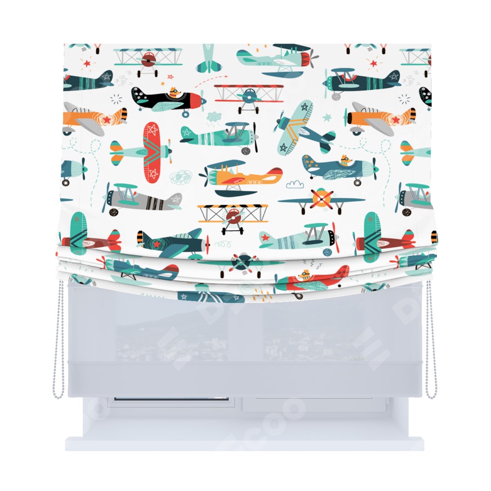 Римская штора день-ночь производителя «Cortin», используется для проёма, пошита из двух полотен, с лицевой блэкаут с нанесением сублимационной печати «Самолёты и пилоты», вторая ткань тюль (по стандарту комплектуется тюль белого цвета артикул V-01). Имеет универсальный механизм и подходит для монтажа: на потолок, на стену и в нишу. Удобное управление каждой шторой отдельно.