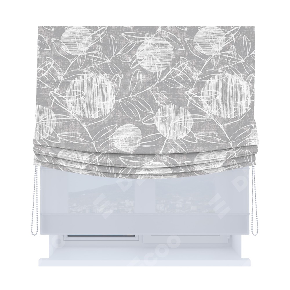 Римская штора день-ночь производителя «Cortin», используется для проёма, пошита из двух полотен, с лицевой блэкаут с нанесением сублимационной печати «Серо-белая фантазия», вторая ткань тюль (по стандарту комплектуется тюль белого цвета артикул V-01). Имеет универсальный механизм и подходит для монтажа: на потолок, на стену и в нишу. Удобное управление каждой шторой отдельно.