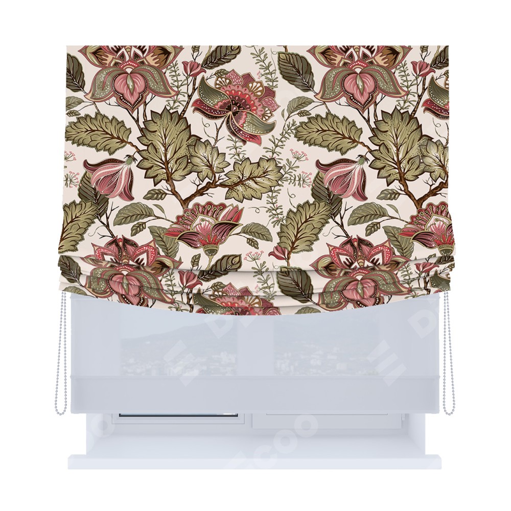 Римская штора день-ночь производителя «Cortin», используется для проёма, пошита из двух полотен, с лицевой блэкаут с нанесением сублимационной печати «Старинные цветы», вторая ткань тюль (по стандарту комплектуется тюль белого цвета артикул V-01). Имеет универсальный механизм и подходит для монтажа: на потолок, на стену и в нишу. Удобное управление каждой шторой отдельно.