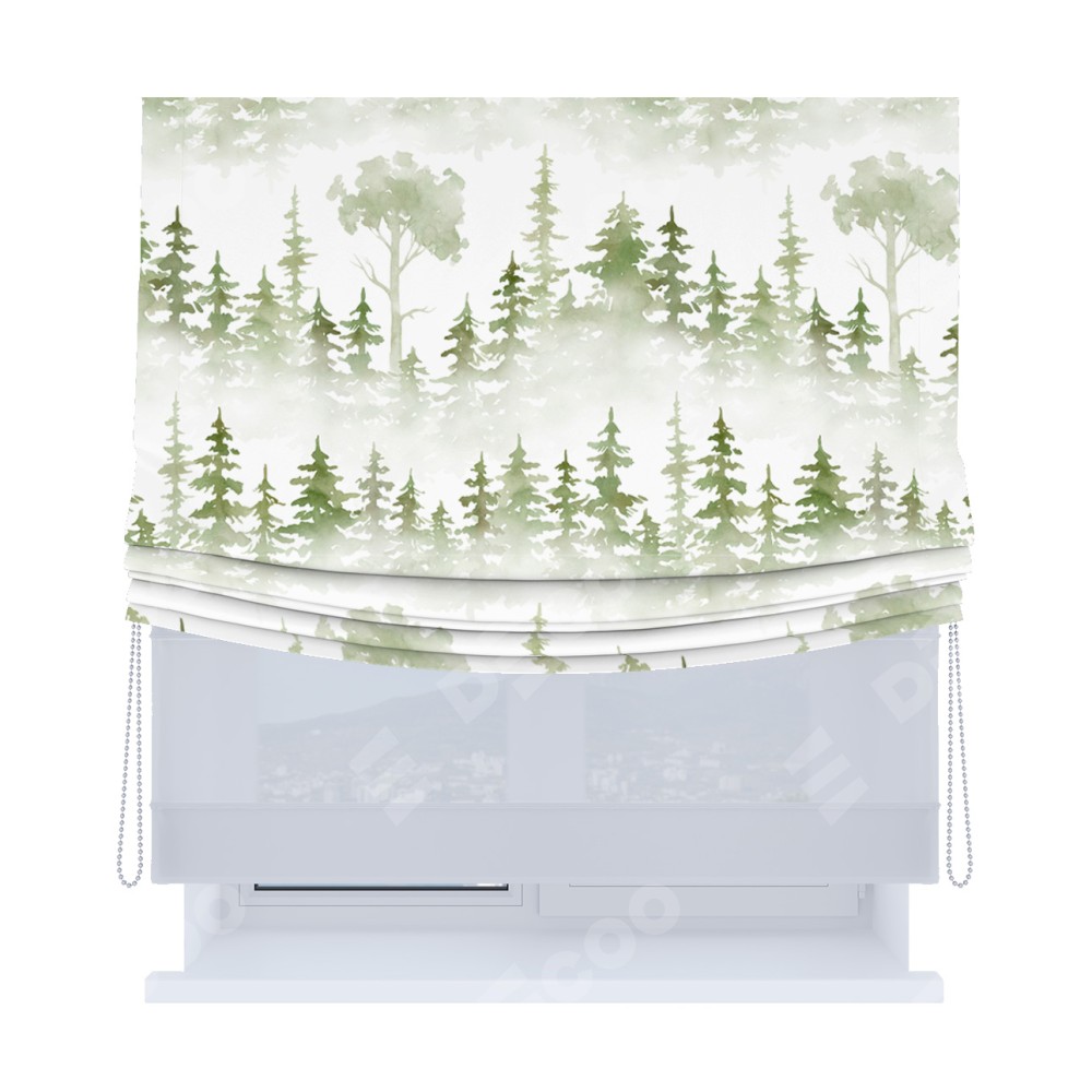 Римская штора день-ночь производителя «Cortin», используется для проёма, пошита из двух полотен, с лицевой блэкаут с нанесением сублимационной печати «Туманный лес», вторая ткань тюль (по стандарту комплектуется тюль белого цвета артикул V-01). Имеет универсальный механизм и подходит для монтажа: на потолок, на стену и в нишу. Удобное управление каждой шторой отдельно.