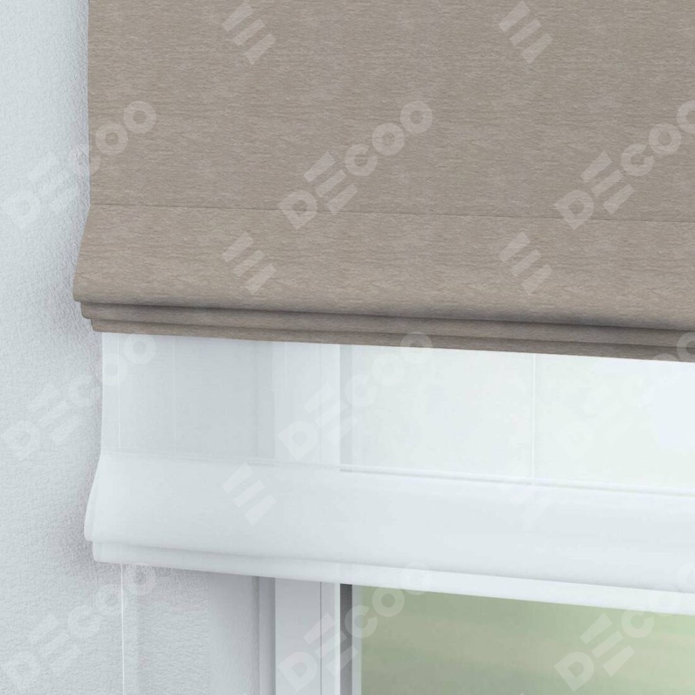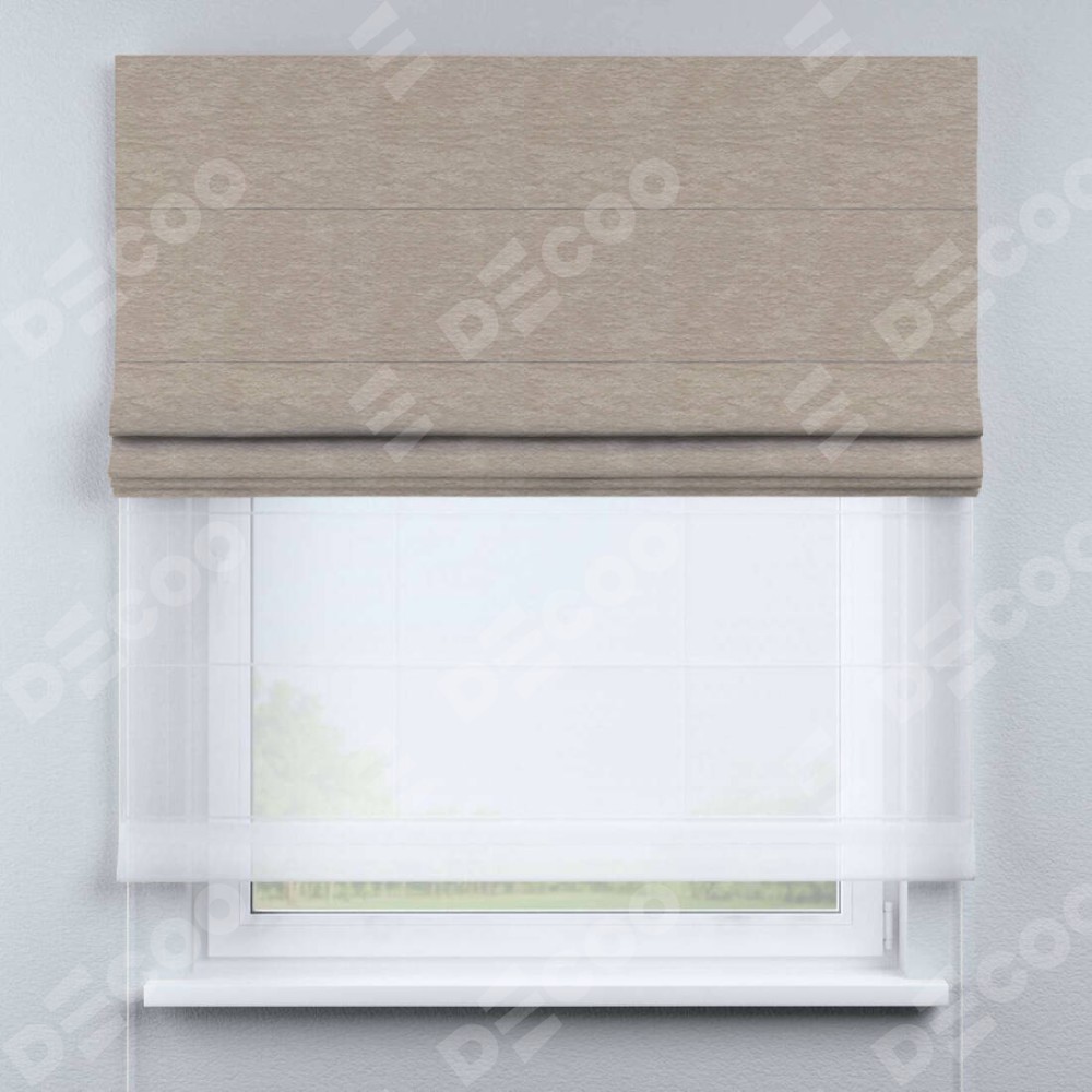 Римская штора день-ночь производителя «Cortin», используется для проёма, пошита из двух полотен, с лицевой стороны софт однотонный тёмно-бежевый артикул 1640, вторая ткань тюль (по стандарту комплектуется тюль белого цвета артикул V-01). Имеет универсальный механизм и подходит для монтажа: на потолок, на стену и в нишу.