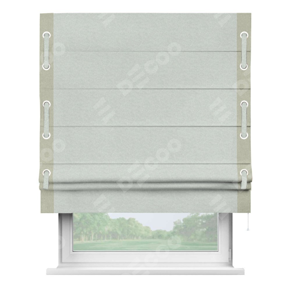 Римская штора производителя «Cortin», используется для проёма, пошита из ткани лён блэкаут белый, артикул 69451. Отделка шторы кантом «Стрим Дуо» на кантах расположены люверсы с пояском, ткань для канта используется из льна разной расцветки на выбор. Ткань для пояска обычно используется из основной ткани шторы, а так же можно сделать из любой расцветки по желанию. Имеет универсальный механизм и подходит для монтажа: на потолок, на стену и в нишу.