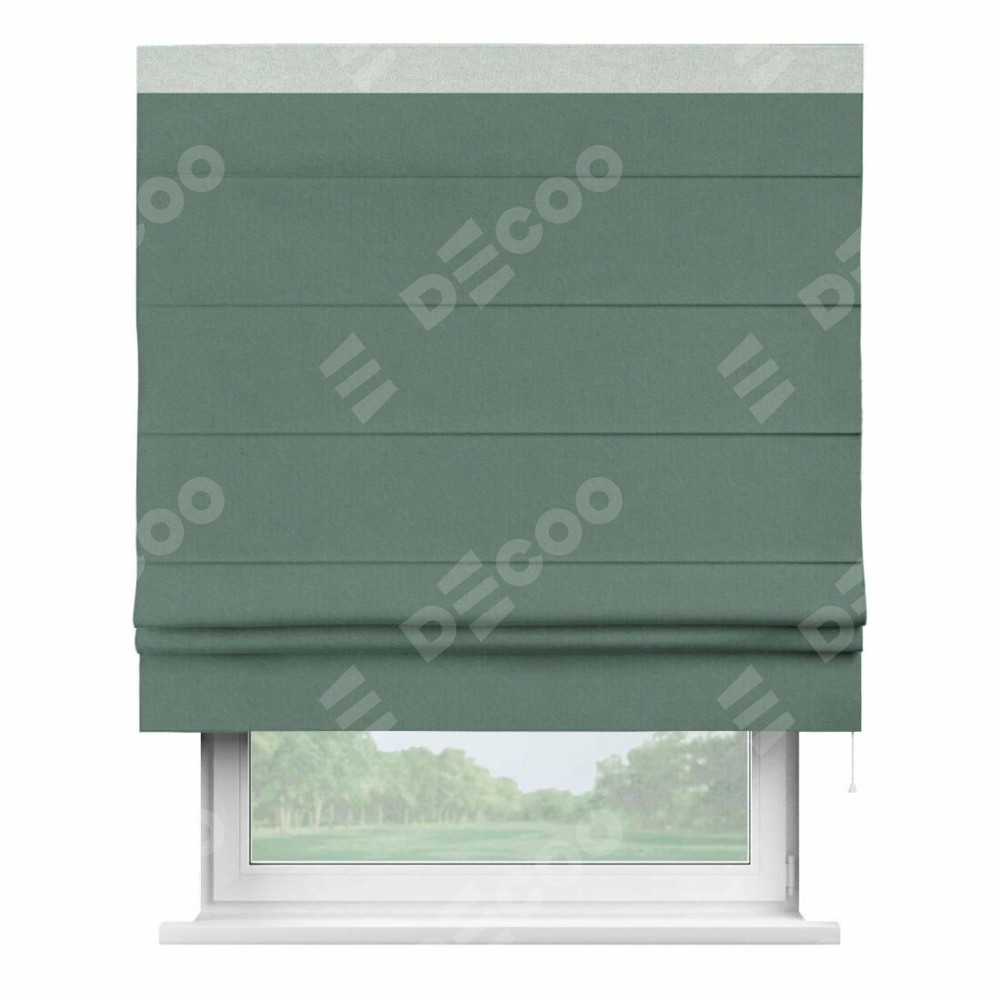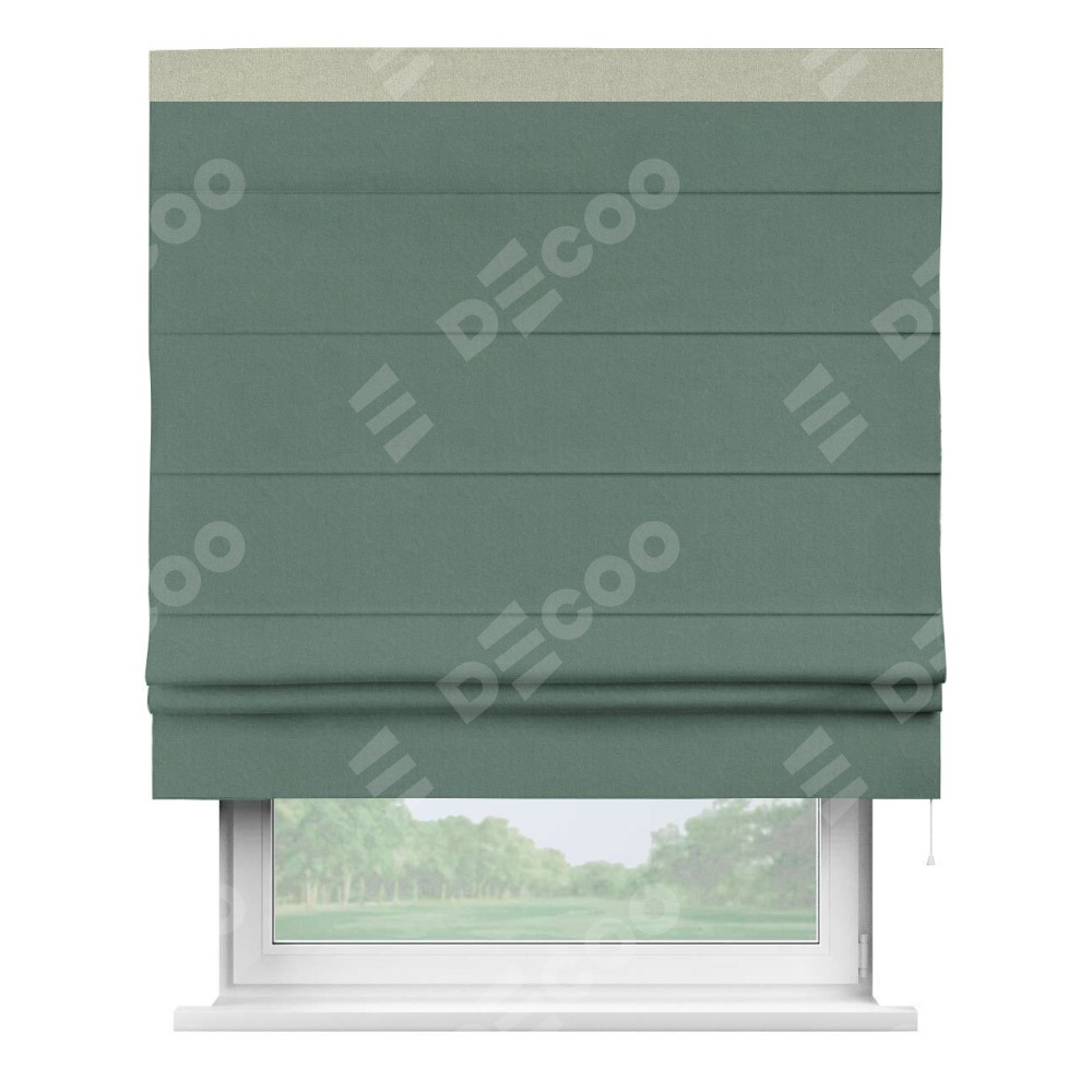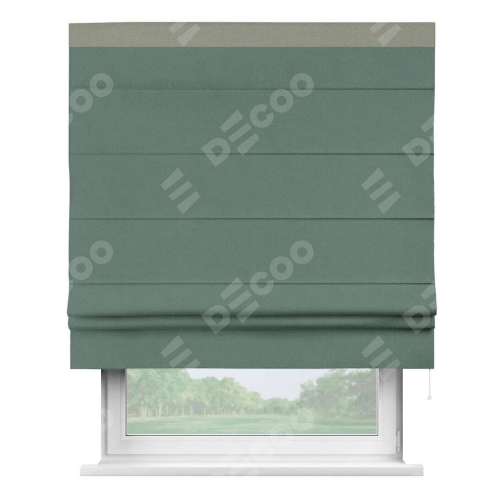 Римская штора производителя «Cortin», используется для проёма, пошита из ткани лён блэкаут бирюзовый, артикул 69517. Отделка шторы кантом «Кинг», ткань для канта используется из льна разной расцветки на выбор. Имеет универсальный механизм и подходит для монтажа: на потолок, на стену и в нишу.