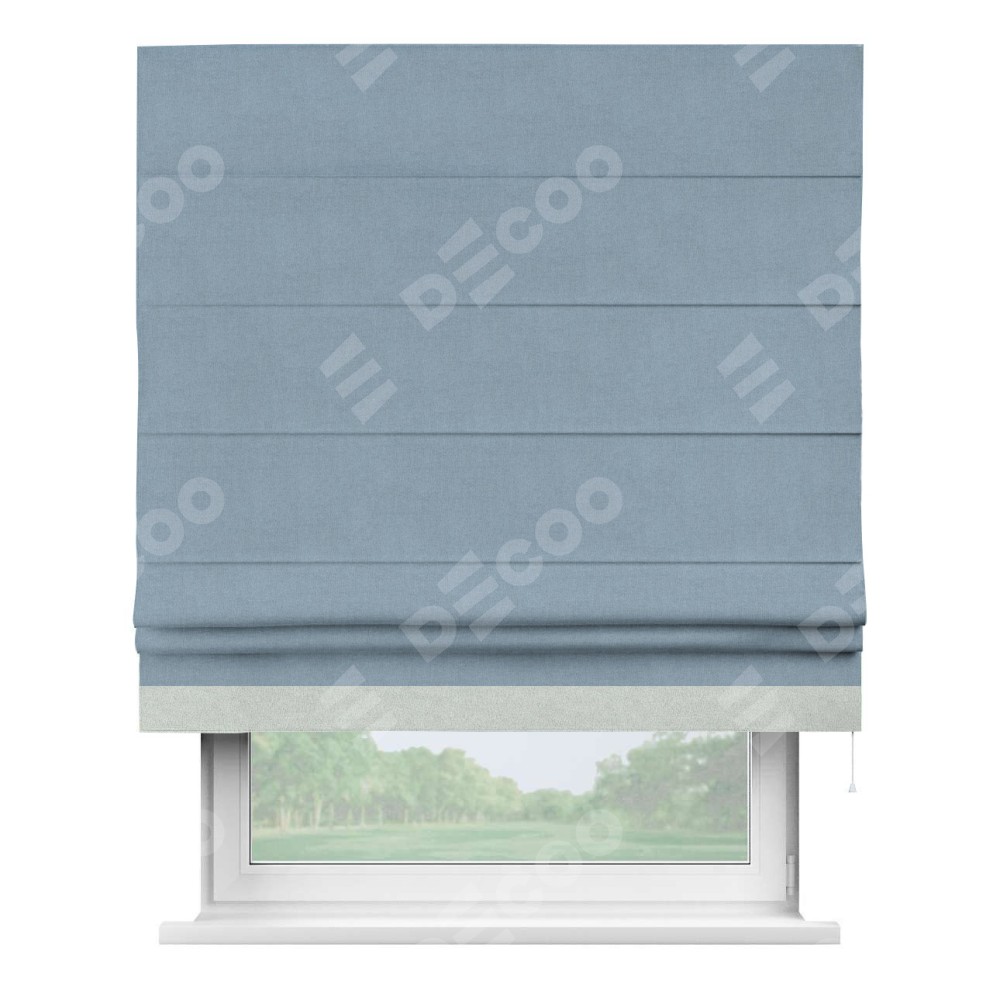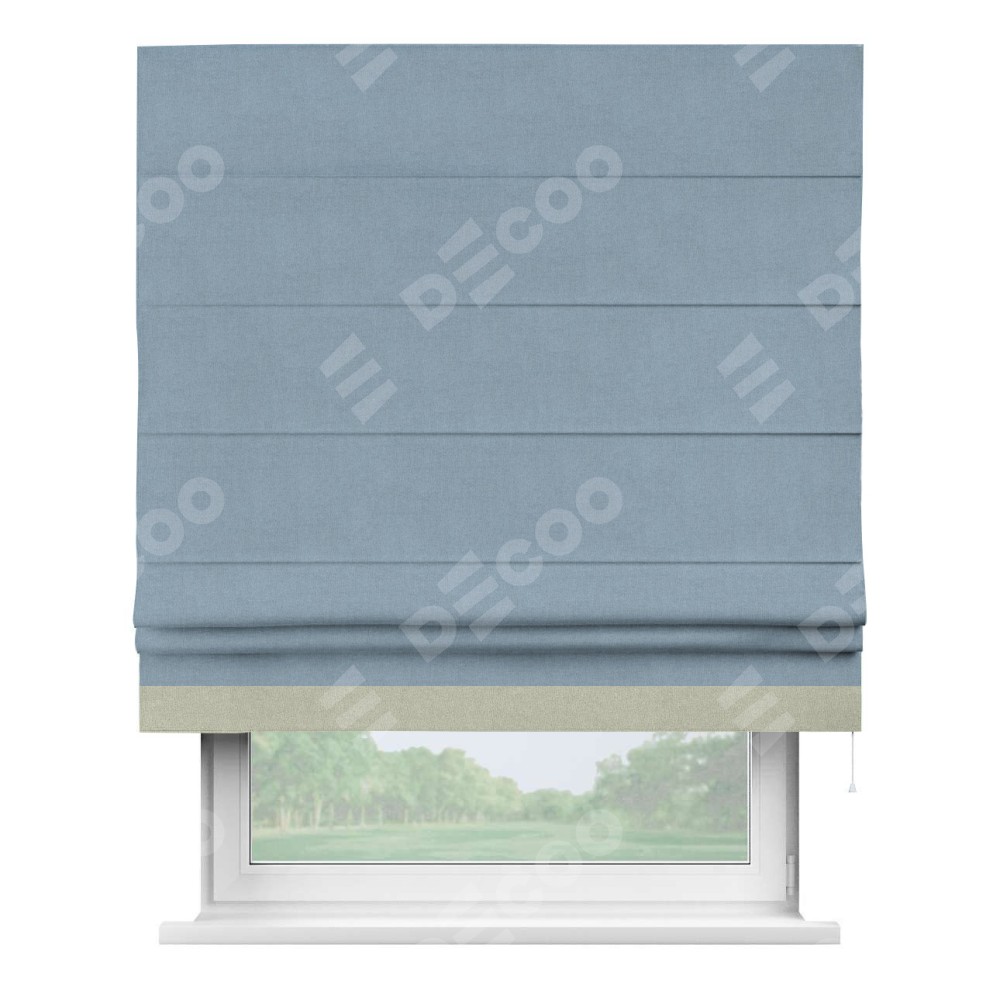 Римская штора производителя «Cortin», используется для проёма, пошита из ткани лён блэкаут голубой, артикул 69574. Отделка шторы кантом «Джестер», ткань для канта используется из льна разной расцветки на выбор. Имеет универсальный механизм и подходит для монтажа: на потолок, на стену и в нишу.