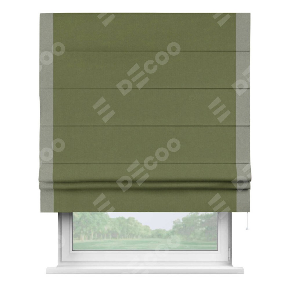 Римская штора производителя «Cortin», используется для проёма, пошита из ткани лён блэкаут оливковый, артикул 69516. Отделка шторы кантом «Стрим Дуо», ткань для канта используется из льна разной расцветки на выбор. Имеет универсальный механизм и подходит для монтажа: на потолок, на стену и в нишу.