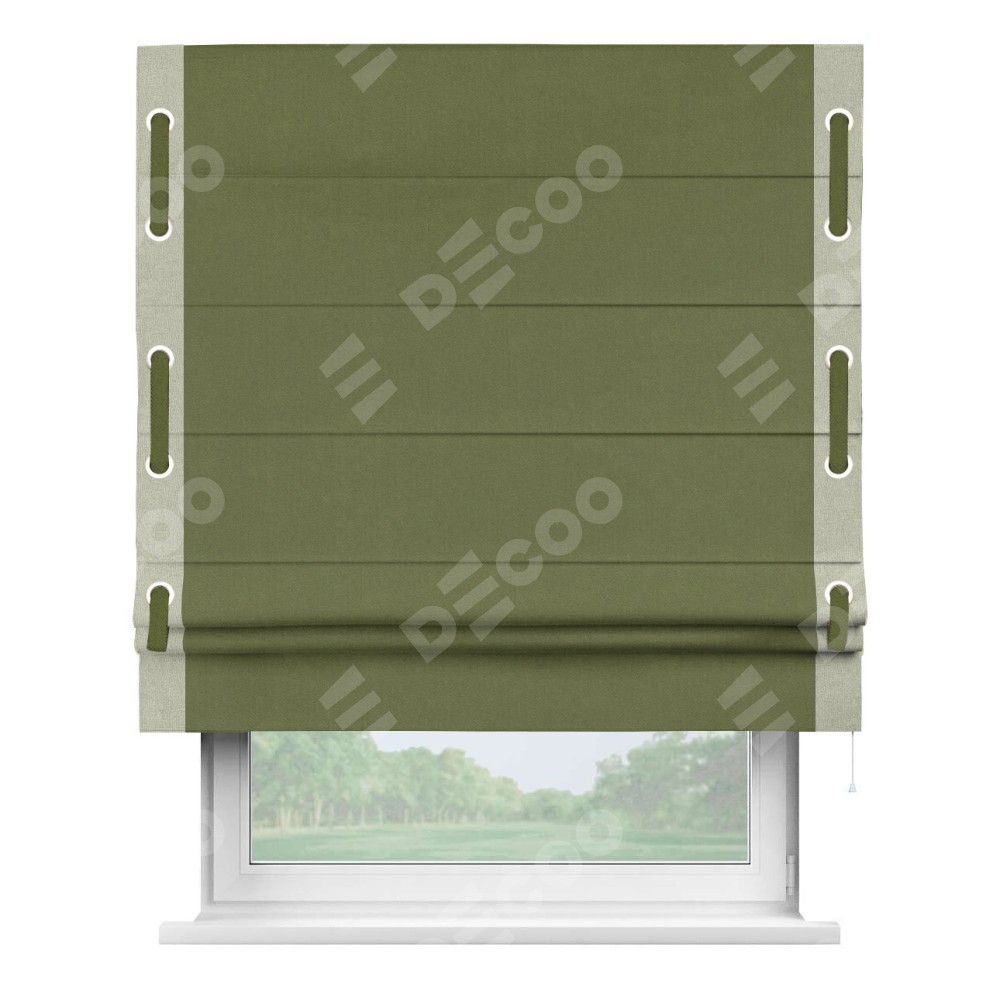 Римская штора производителя «Cortin», используется для проёма, пошита из ткани лён блэкаут оливковый, артикул 69516. Отделка шторы кантом «Стрим Дуо» на кантах расположены люверсы с пояском, ткань для канта используется из льна разной расцветки на выбор. Ткань для пояска обычно используется из основной ткани шторы, а так же можно сделать из любой расцветки по желанию. Имеет универсальный механизм и подходит для монтажа: на потолок, на стену и в нишу.