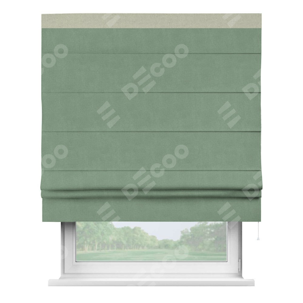 Римская штора производителя «Cortin», используется для проёма, пошита из ткани лён блэкаут светло-бирюзовый, артикул 69443. Отделка шторы кантом «Кинг», ткань для канта используется из льна разной расцветки на выбор. Имеет универсальный механизм и подходит для монтажа: на потолок, на стену и в нишу.