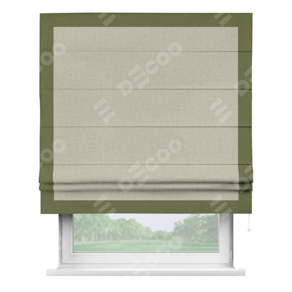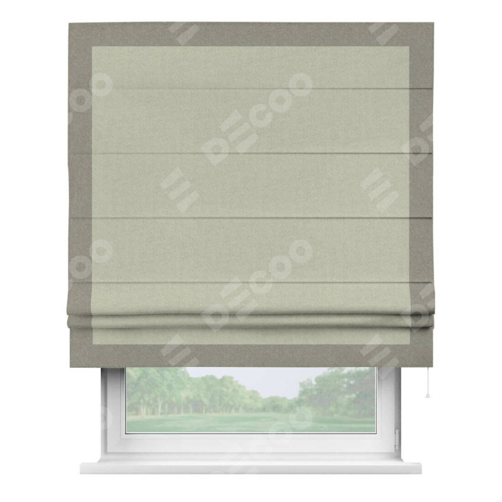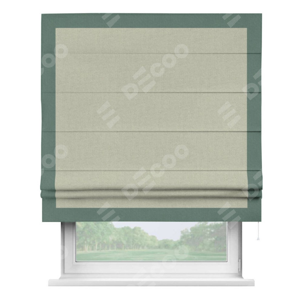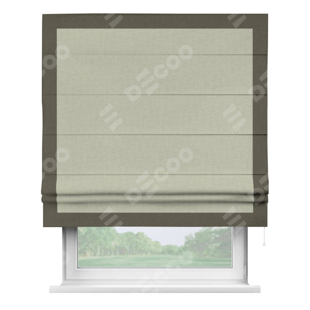 Римская штора производителя «Cortin», используется для проёма, пошита из ткани лён блэкаут серо-бежевый, артикул 69450. Отделка шторы кантом «Чесс», ткань для канта используется из льна разной расцветки на выбор. Имеет универсальный механизм и подходит для монтажа: на потолок, на стену и в нишу.