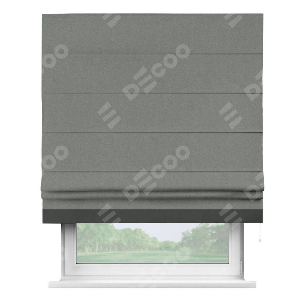 Римская штора производителя «Cortin», используется для проёма, пошита из ткани лён блэкаут серый, артикул 69447. Отделка шторы кантом «Джестер», ткань для канта используется из льна разной расцветки на выбор. Имеет универсальный механизм и подходит для монтажа: на потолок, на стену и в нишу.