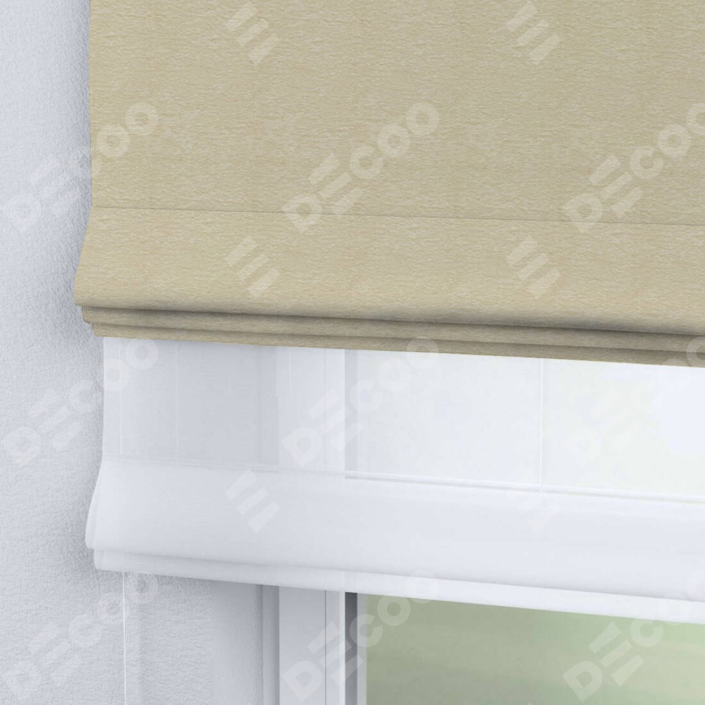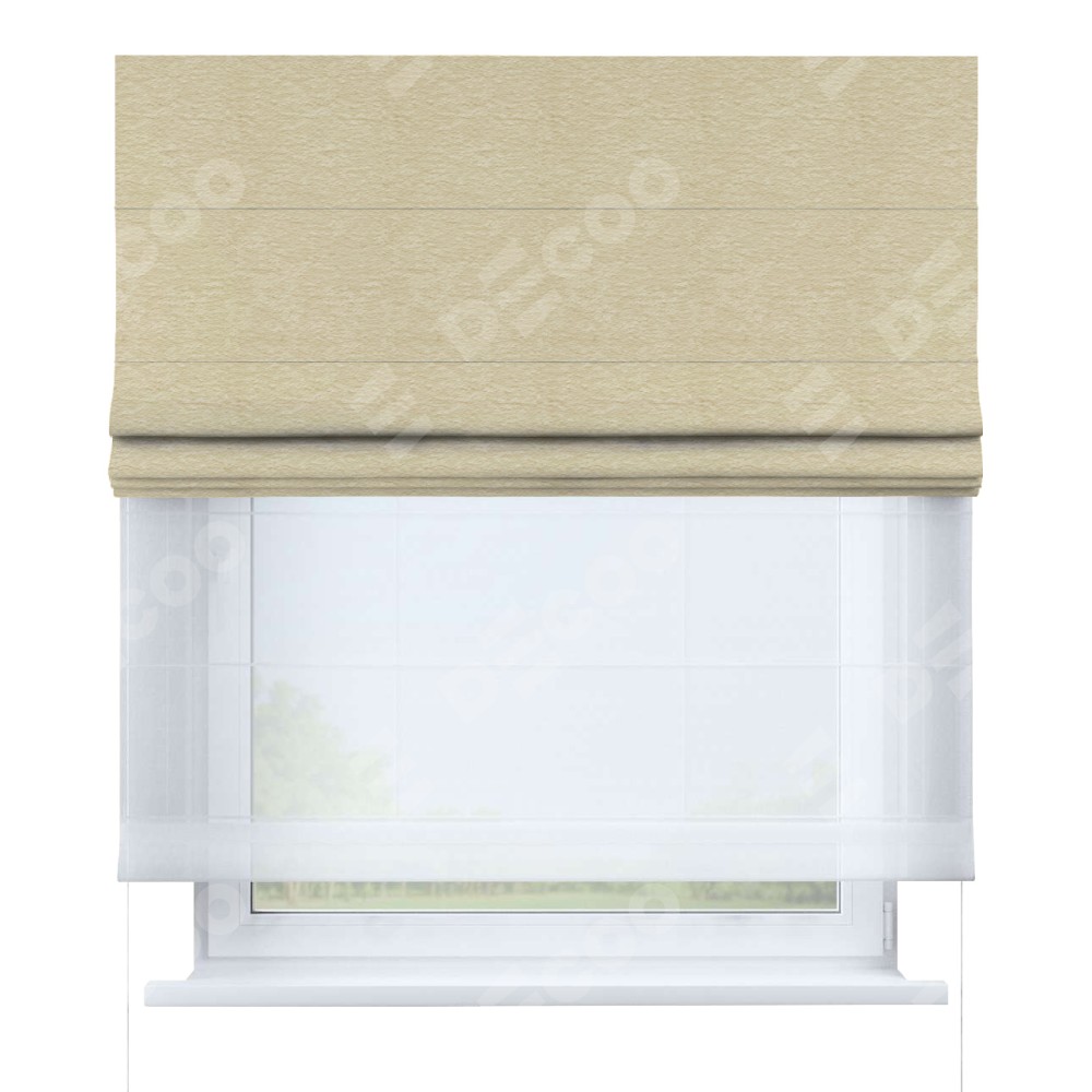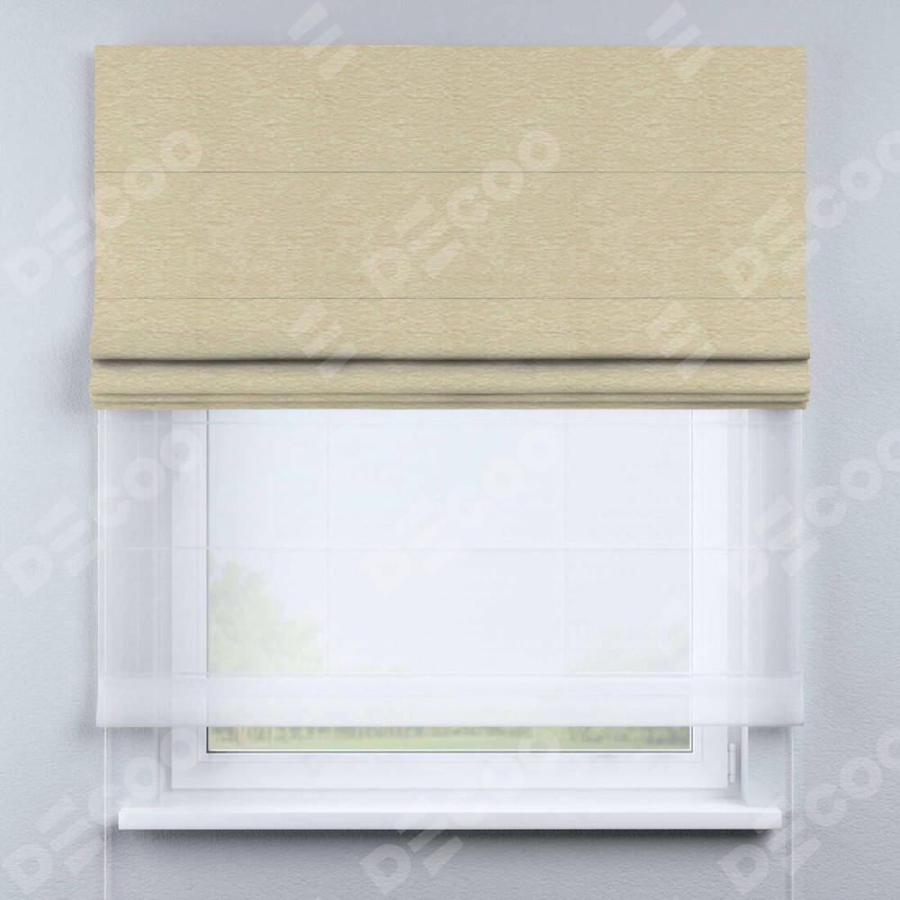 Римская штора день-ночь производителя «Cortin», используется для проёма, пошита из двух полотен, с лицевой стороны софт однотонный светло-бежевый артикул 54426, вторая ткань тюль (по стандарту комплектуется тюль белого цвета артикул V-01). Имеет универсальный механизм и подходит для монтажа: на потолок, на стену и в нишу.
