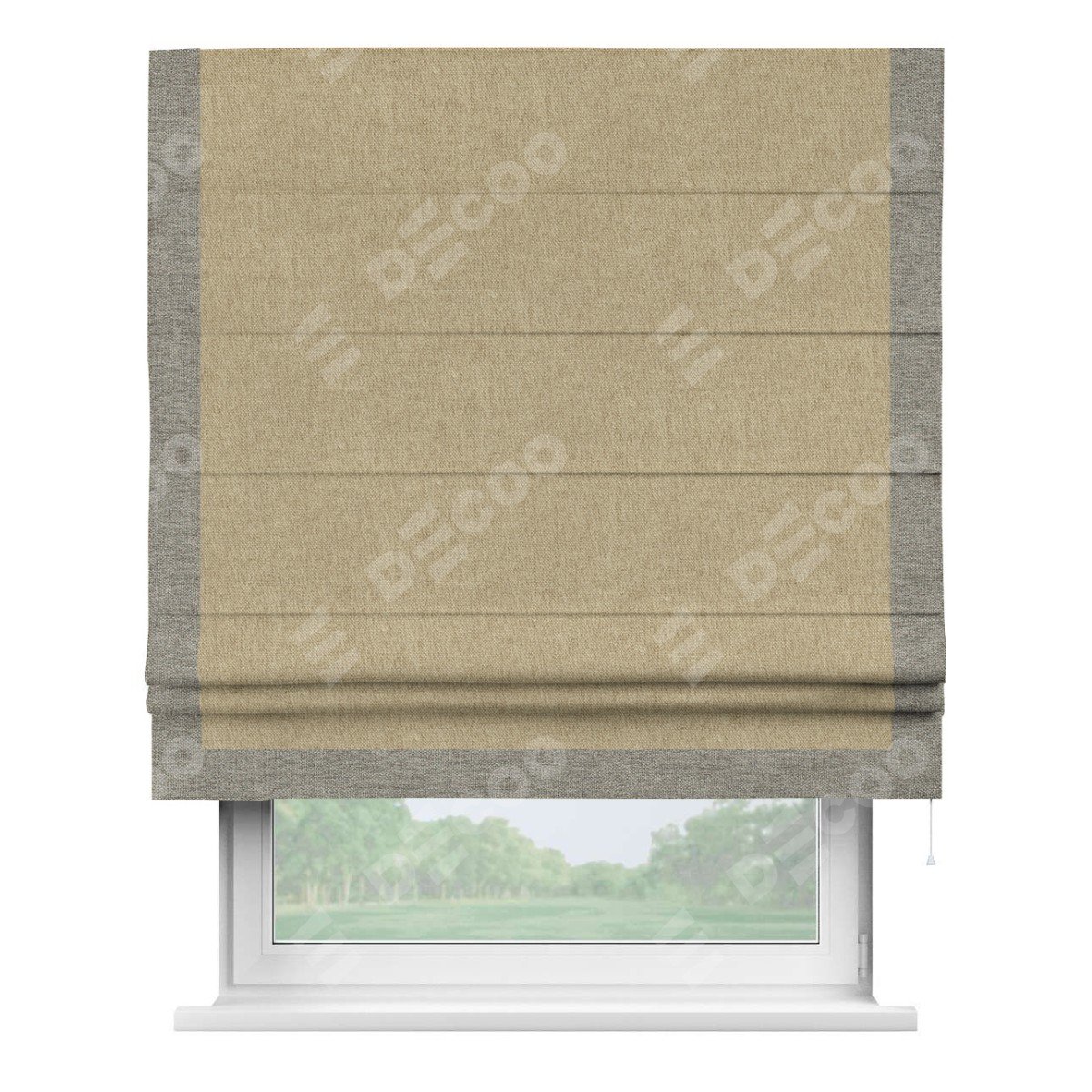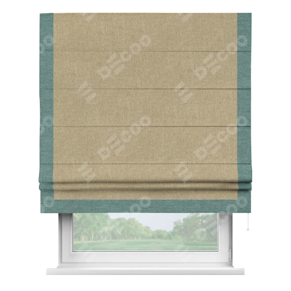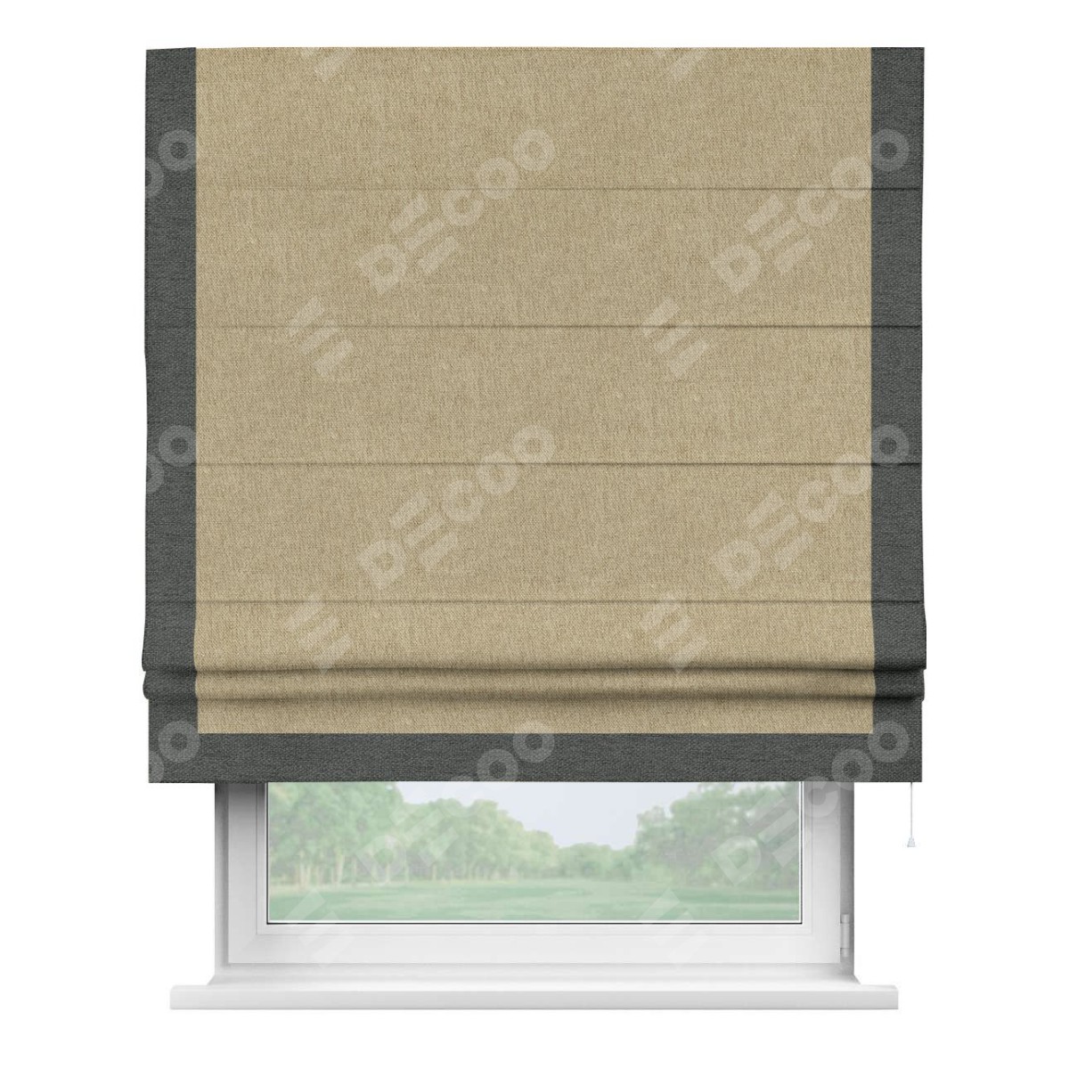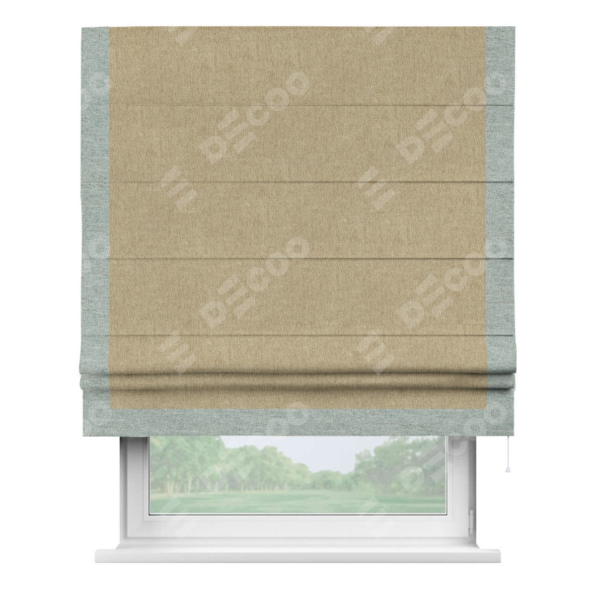 Римская штора производителя «Cortin», используется для проёма, пошита из ткани стиф димаут бежевый, артикул 18083. Отделка шторы кантом «Виктория», ткань для канта используется из стифа разной расцветки на выбор. Имеет универсальный механизм и подходит для монтажа: на потолок, на стену и в нишу.