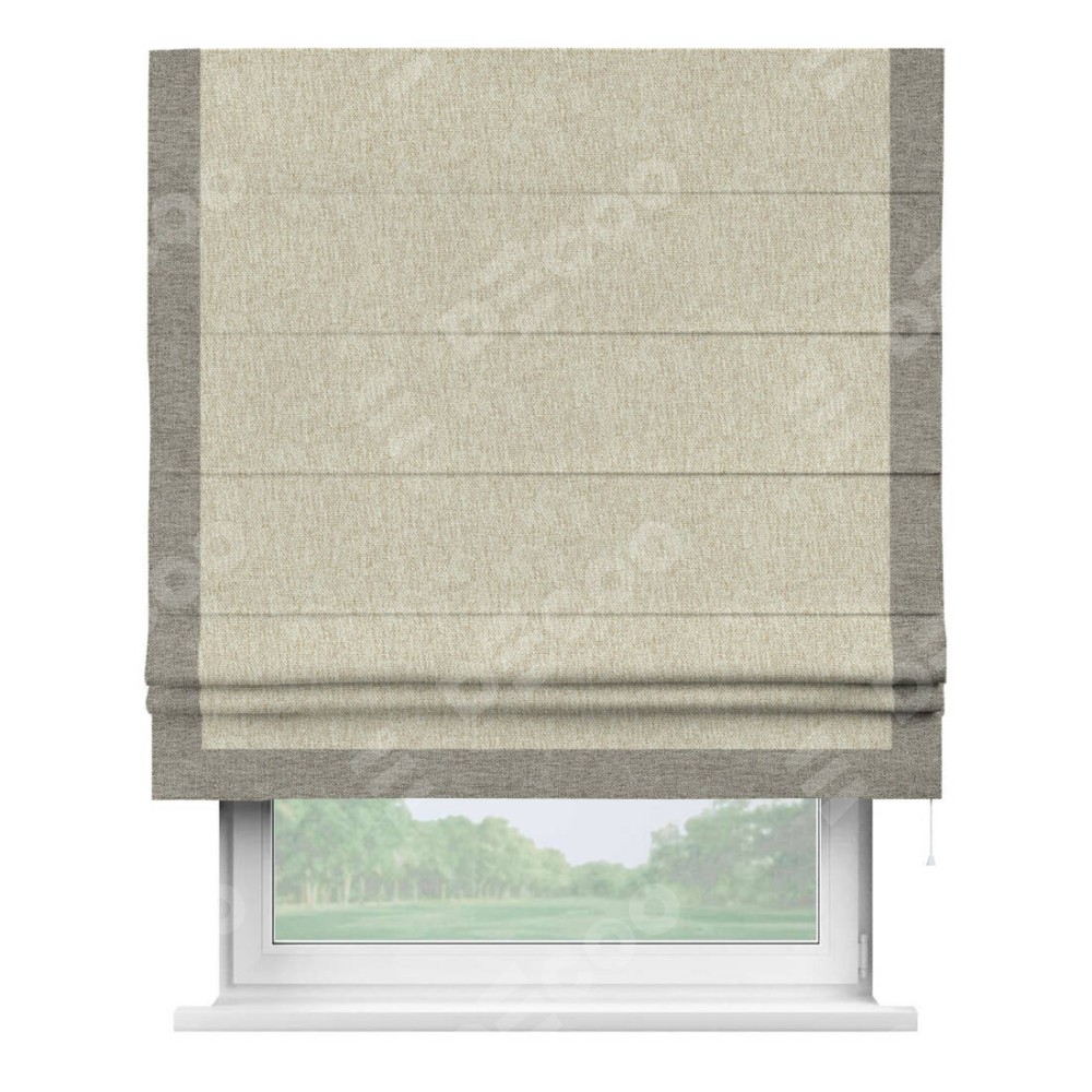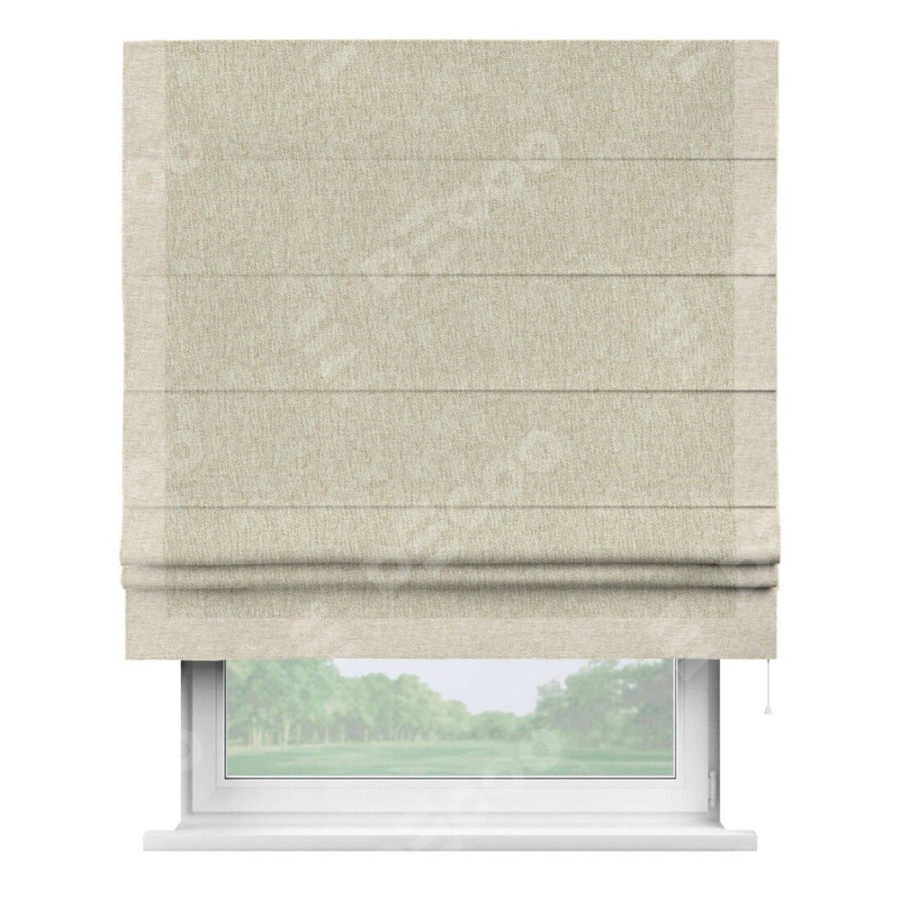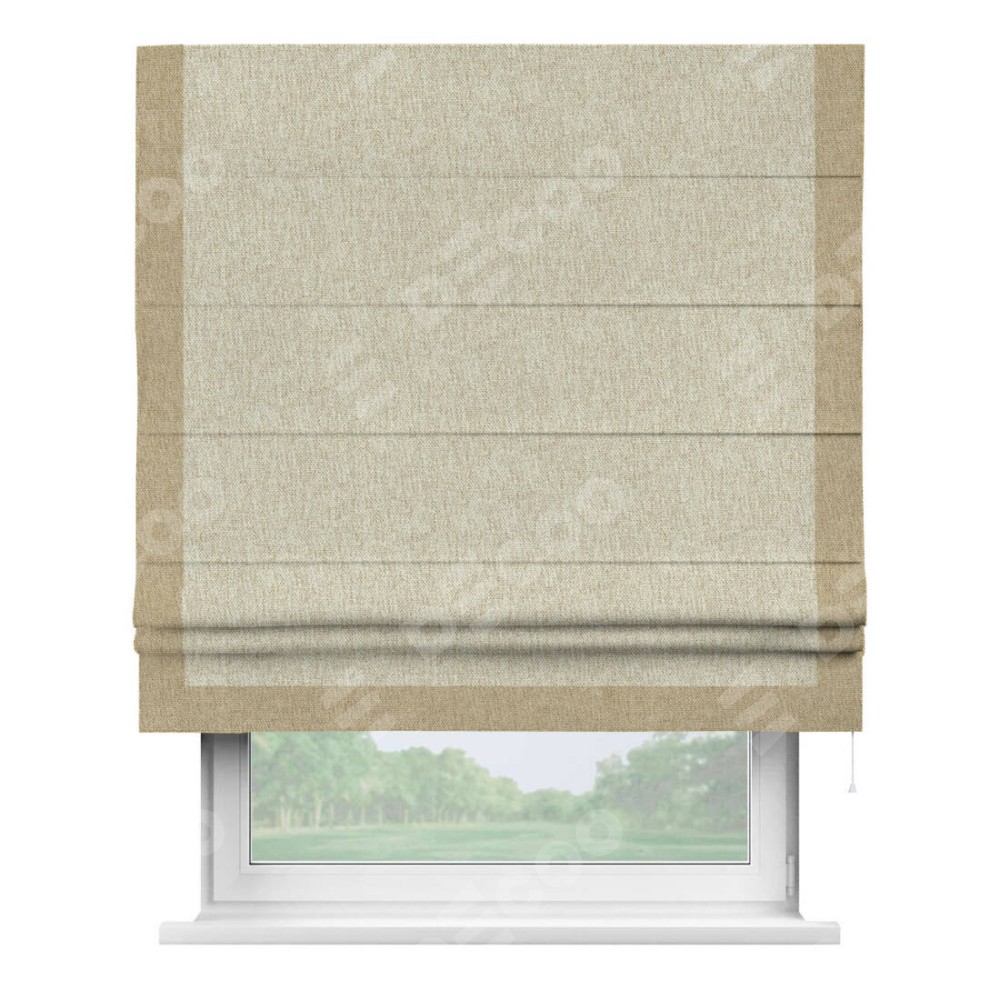 Римская штора производителя «Cortin», используется для проёма, пошита из ткани стиф димаут светло-бежевый, артикул 18084. Отделка шторы кантом «Виктория», ткань для канта используется из стифа разной расцветки на выбор. Имеет универсальный механизм и подходит для монтажа: на потолок, на стену и в нишу.