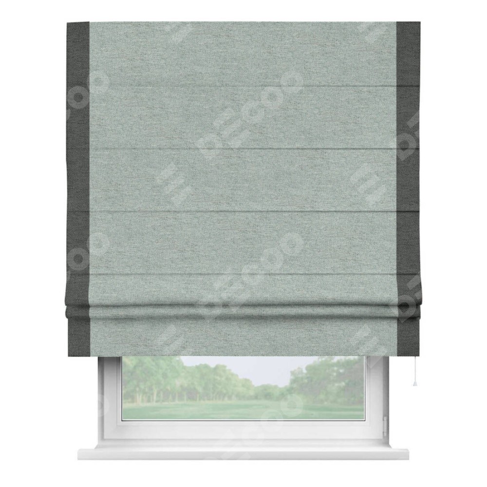 Римская штора производителя «Cortin», используется для проёма, пошита из ткани стиф димаут светло-серый, артикул 44025. Отделка шторы кантом «Стрим Дуо», ткань для канта используется из стифа разной расцветки на выбор. Имеет универсальный механизм и подходит для монтажа: на потолок, на стену и в нишу.