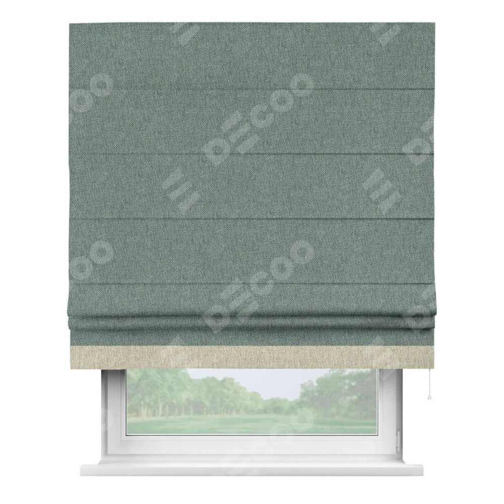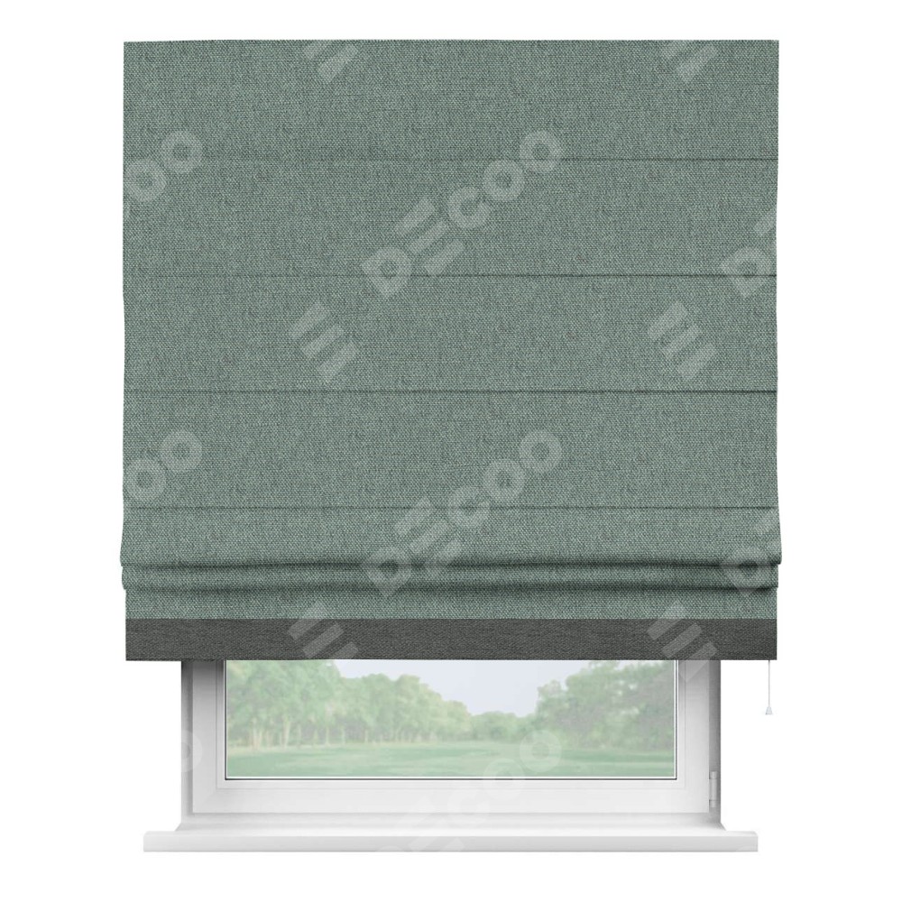 Римская штора производителя «Cortin», используется для проёма, пошита из ткани стиф димаут серо-голубой, артикул 44029. Отделка шторы кантом «Джестер», ткань для канта используется из стифа разной расцветки на выбор. Имеет универсальный механизм и подходит для монтажа: на потолок, на стену и в нишу.
