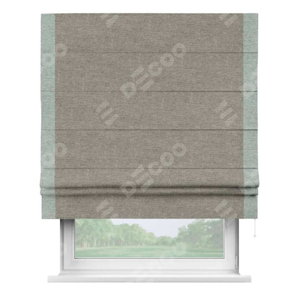 Римская штора производителя «Cortin», используется для проёма, пошита из ткани стиф димаут серо-коричневый, артикул 44028. Отделка шторы кантом «Стрим Дуо», ткань для канта используется из стифа разной расцветки на выбор. Имеет универсальный механизм и подходит для монтажа: на потолок, на стену и в нишу.