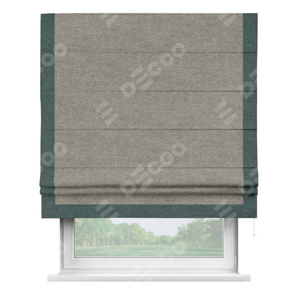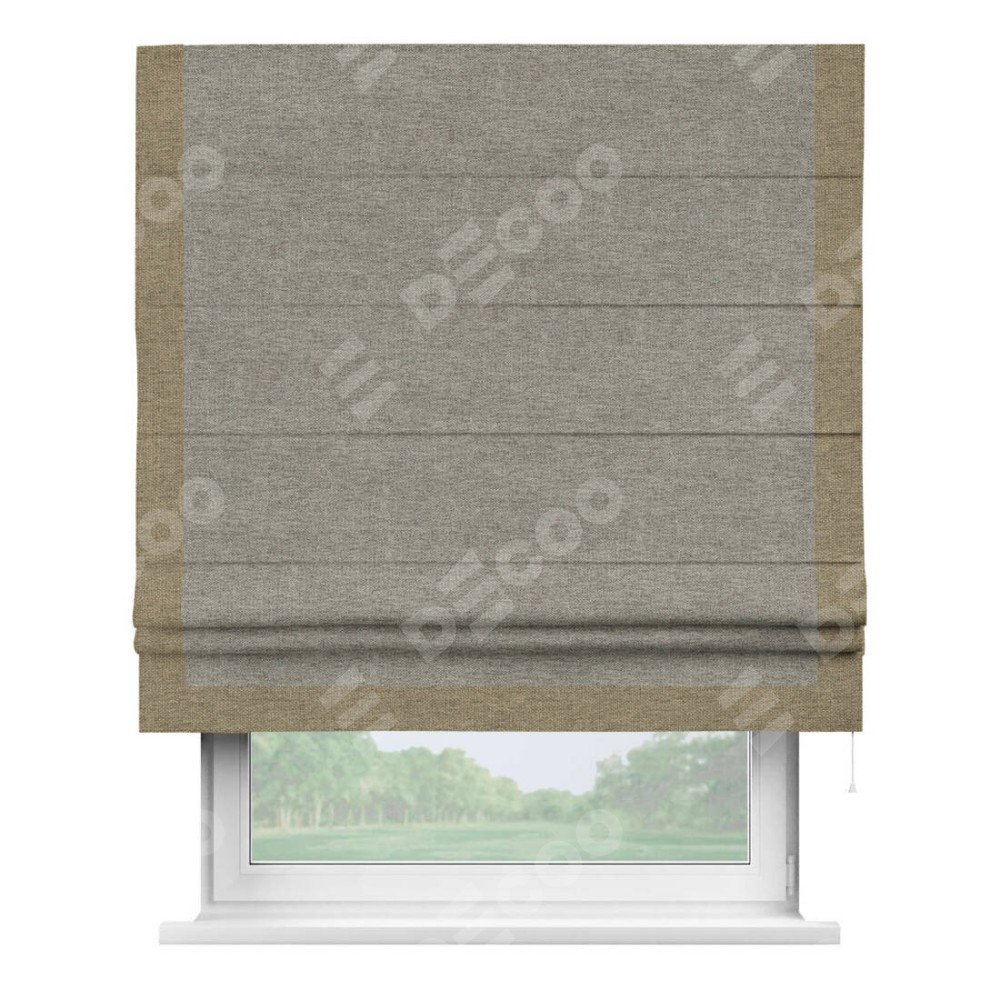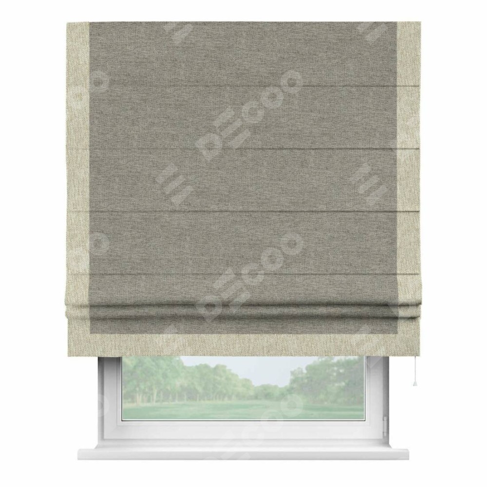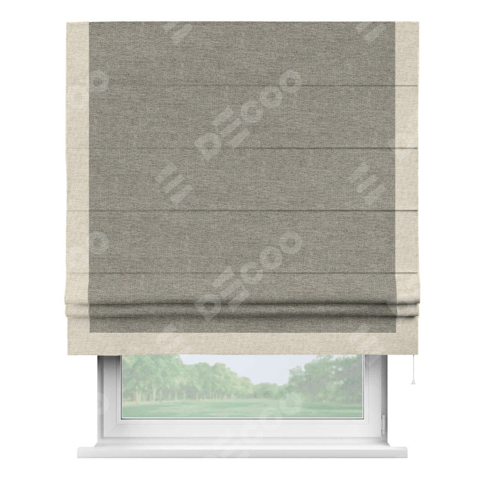 Римская штора производителя «Cortin», используется для проёма, пошита из ткани стиф димаут серо-коричневый, артикул 44028. Отделка шторы кантом «Виктория», ткань для канта используется из стифа разной расцветки на выбор. Имеет универсальный механизм и подходит для монтажа: на потолок, на стену и в нишу.