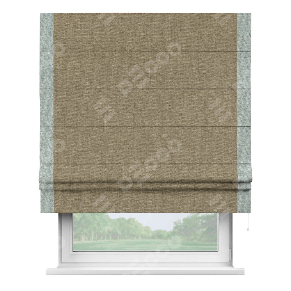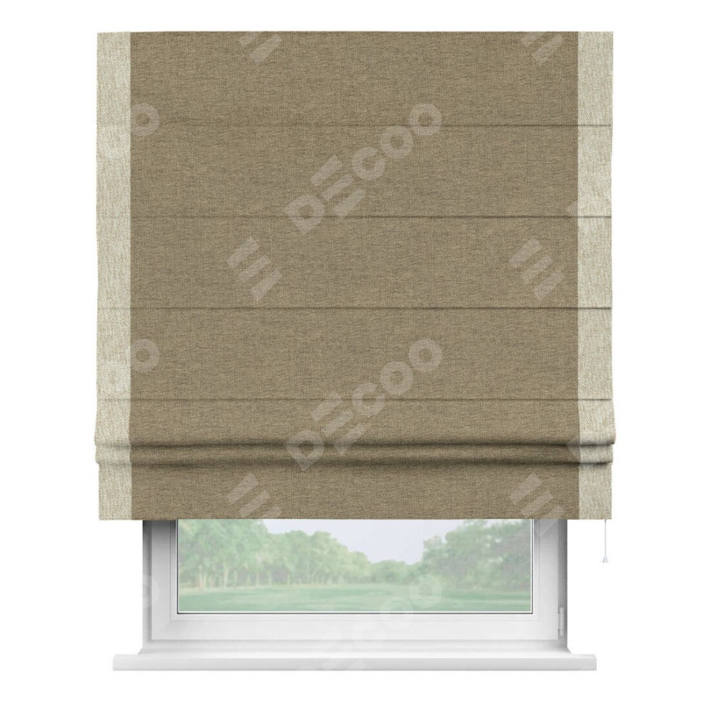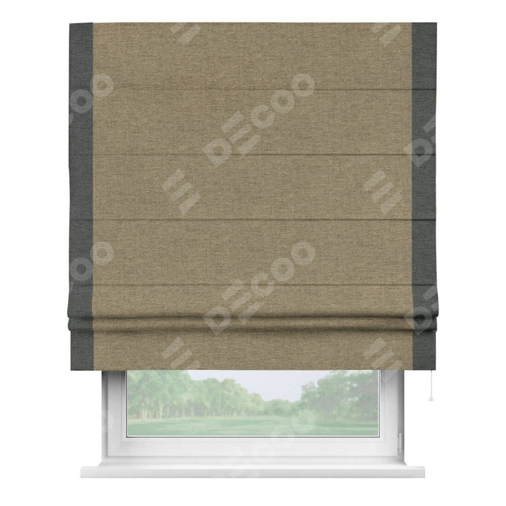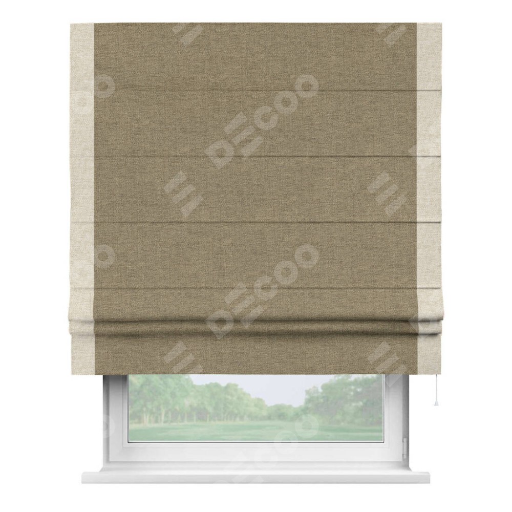 Римская штора производителя «Cortin», используется для проёма, пошита из ткани стиф димаут тёмно-бежевый, артикул 18085. Отделка шторы кантом «Стрим Дуо», ткань для канта используется из стифа разной расцветки на выбор. Имеет универсальный механизм и подходит для монтажа: на потолок, на стену и в нишу.