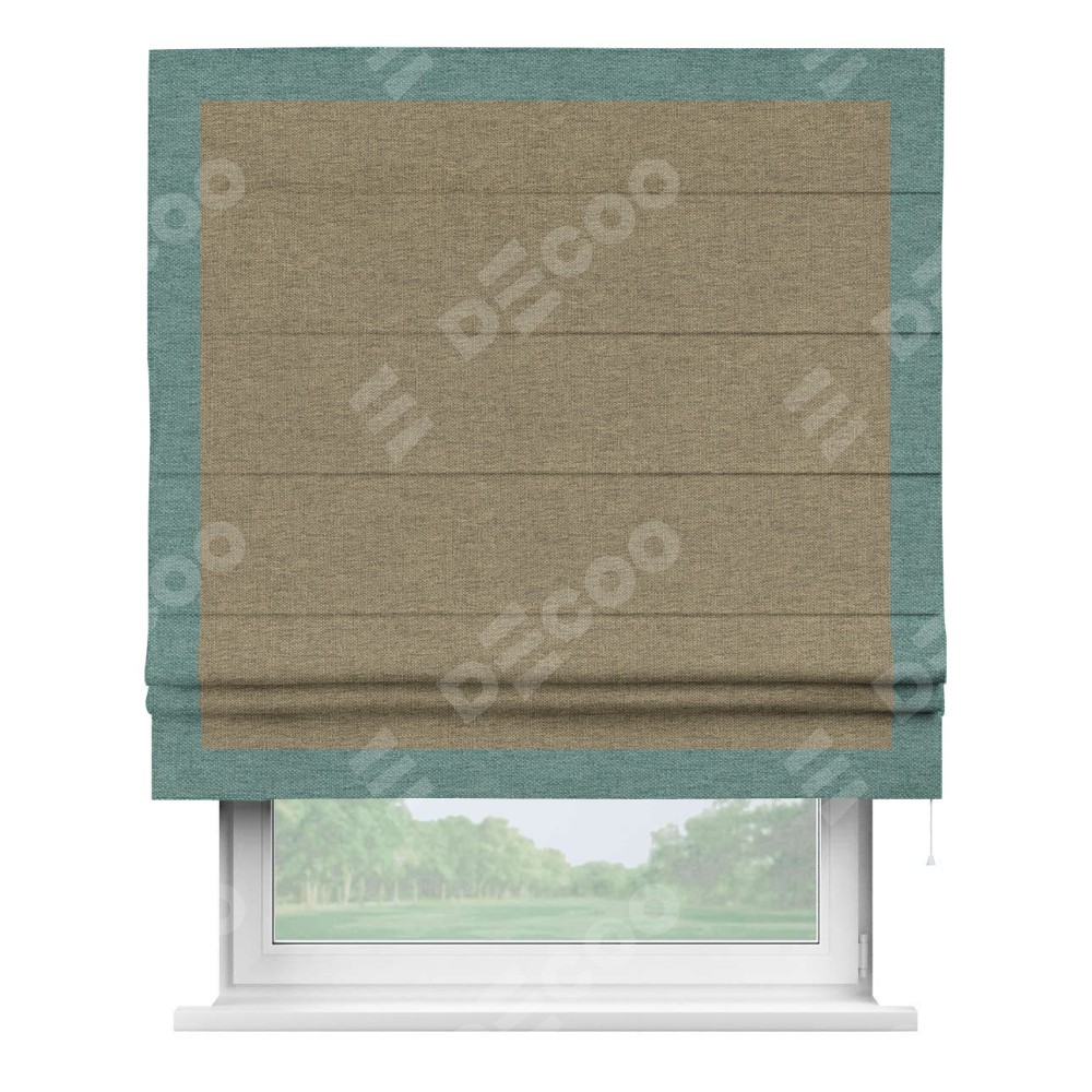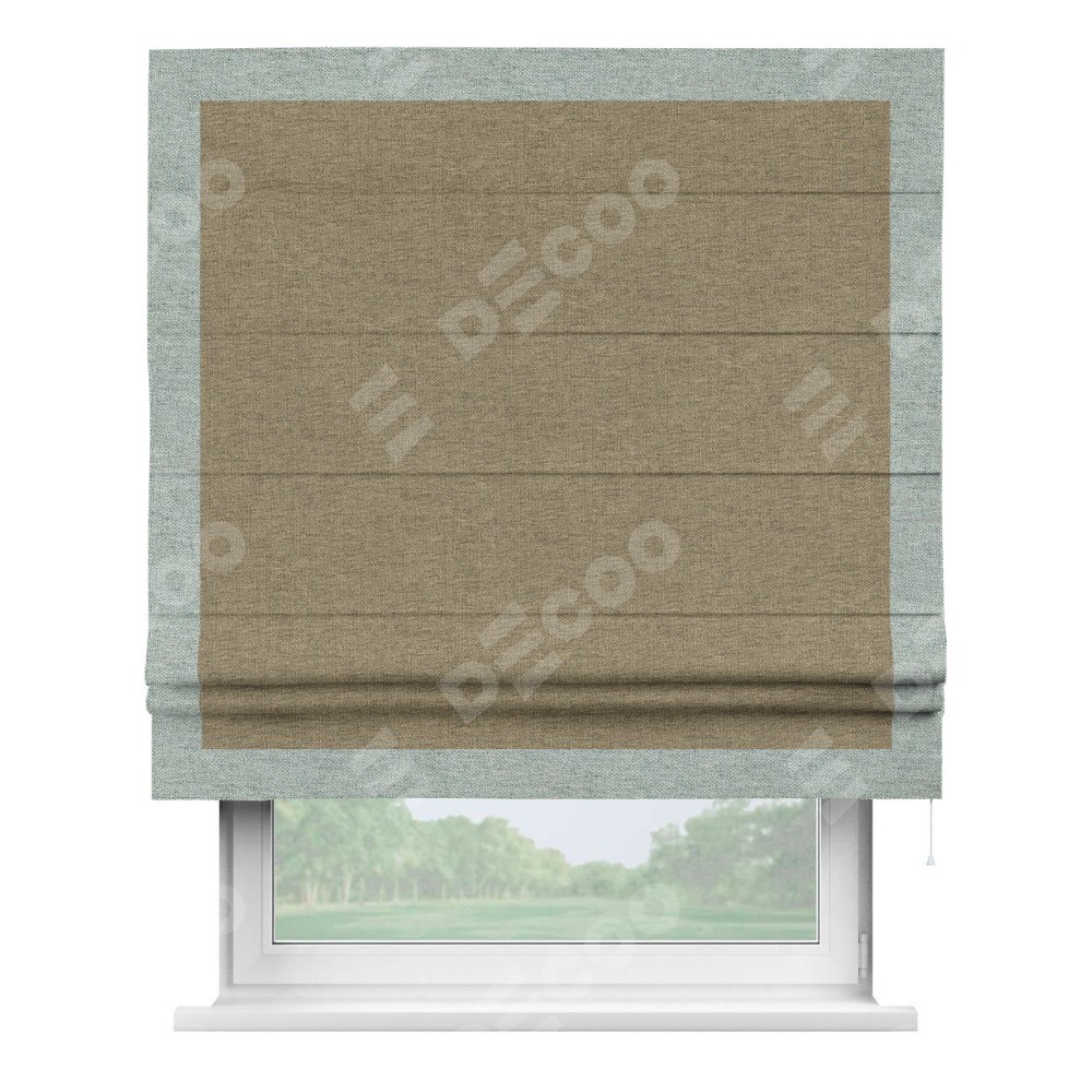 Римская штора производителя «Cortin», используется для проёма, пошита из ткани стиф димаут тёмно-бежевый, артикул 18085. Отделка шторы кантом «Чесс», ткань для канта используется из стифа разной расцветки на выбор. Имеет универсальный механизм и подходит для монтажа: на потолок, на стену и в нишу.