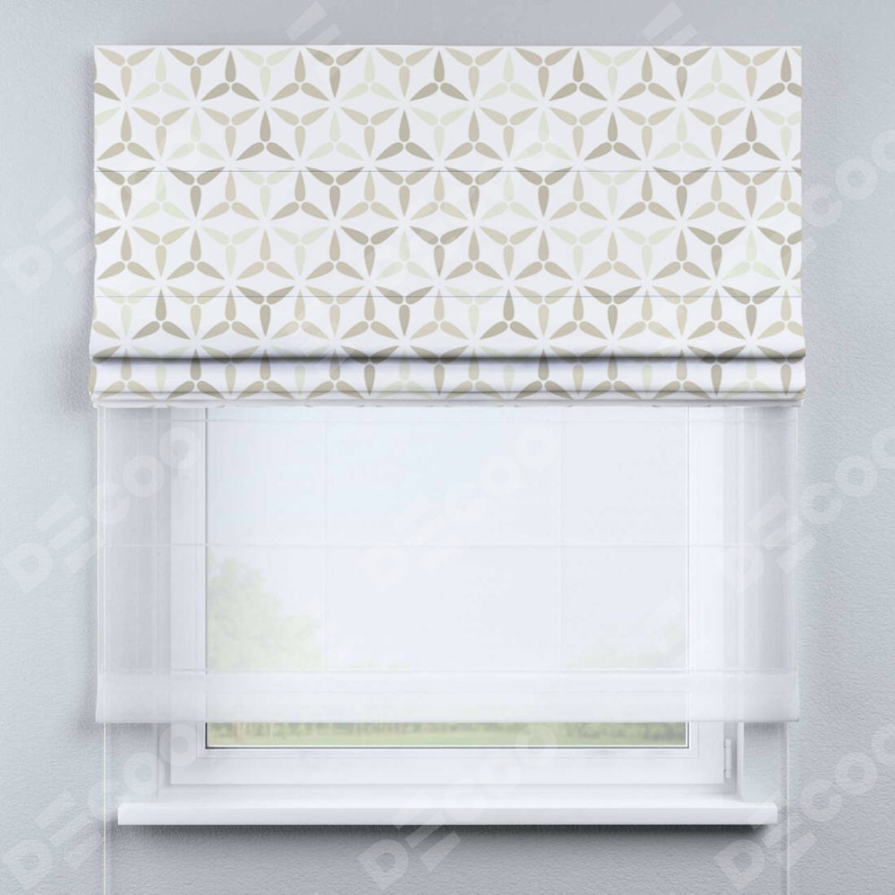 Римская штора день-ночь производителя «Cortin», используется для проёма, пошита из двух полотен, с лицевой блэкаут с нанесением сублимационной печати «Бежевая графика», вторая ткань тюль (по стандарту комплектуется тюль белого цвета артикул V-01). Имеет универсальный механизм и подходит для монтажа: на потолок, на стену и в нишу.
