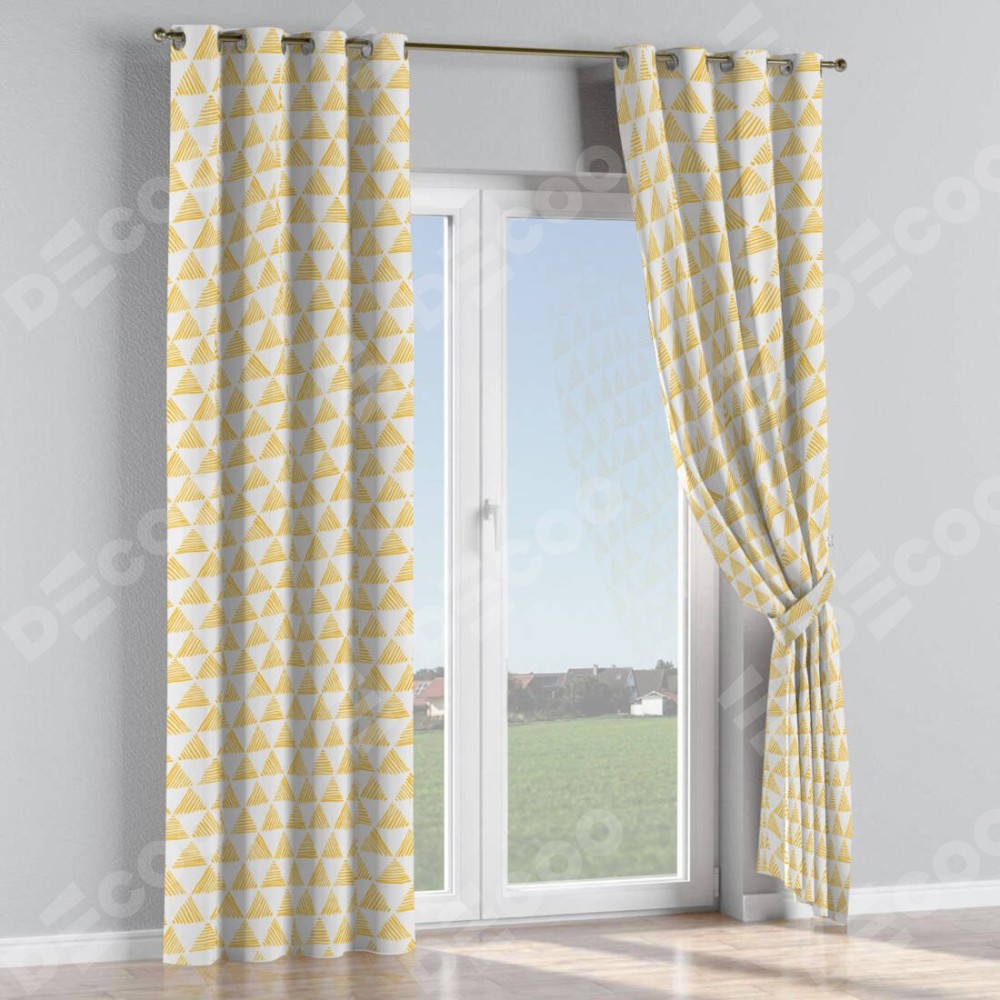 Комплект прямых штор, от производителя «Cortin», пошиты из ткани блэкаут с нанесением сублимационной печати «Желтые треугольники». Данная модель пошита на люверсах, комплектуется на выбор круглым карнизом и подходит для монтажа на стену или потолок. Прямые шторы на люверсах шьются по стандарту с коэффициентом 1/2 (на 100 см. ширины проёма 200 см. ширины ткани), отличительным преимуществом данной модели является простой способ монтажа. Достаточно повесить ее на трубу и штора готова!