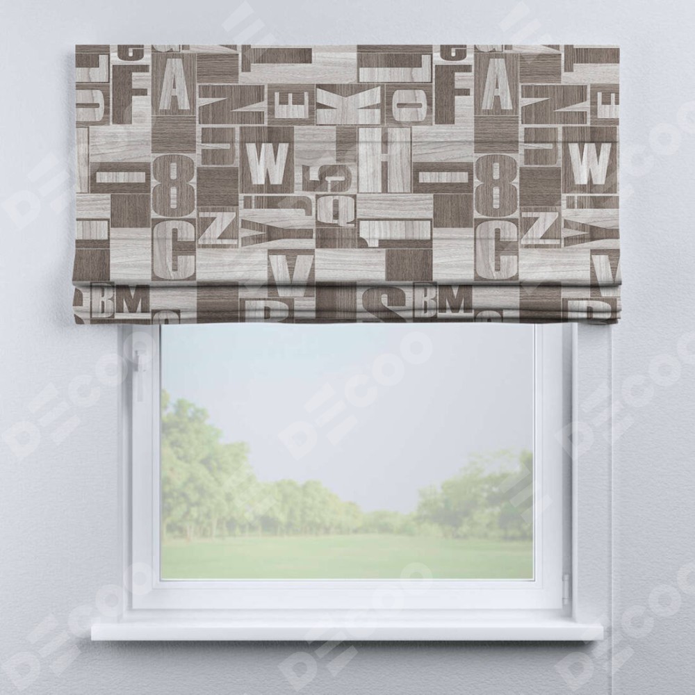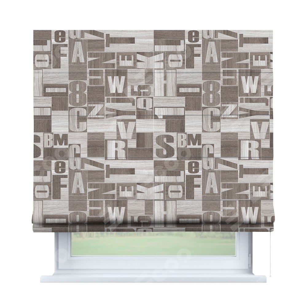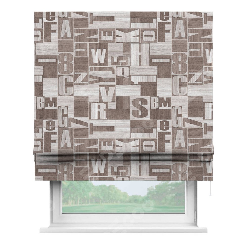 Римская штора производителя «Cortin», используется для проёма, пошита из ткани блэкаут с нанесением сублимационной печати «Литеры лофт». Имеет универсальный механизм и подходит для монтажа: на потолок, на стену и в нишу.
