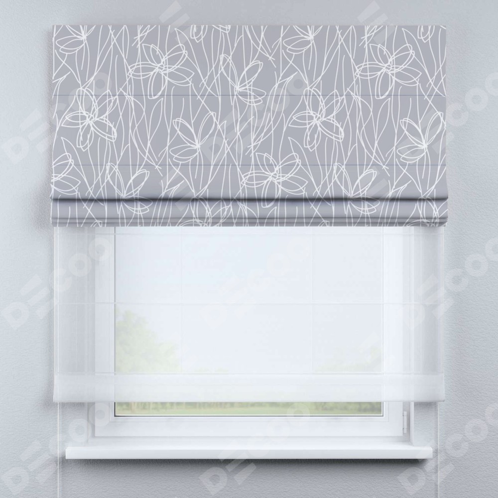 Римская штора день-ночь производителя «Cortin», используется для проёма, пошита из двух полотен, с лицевой блэкаут с нанесением сублимационной печати «Нарисованные цветы», вторая ткань тюль (по стандарту комплектуется тюль белого цвета артикул V-01). Имеет универсальный механизм и подходит для монтажа: на потолок, на стену и в нишу.