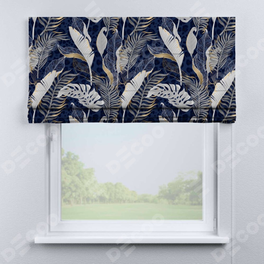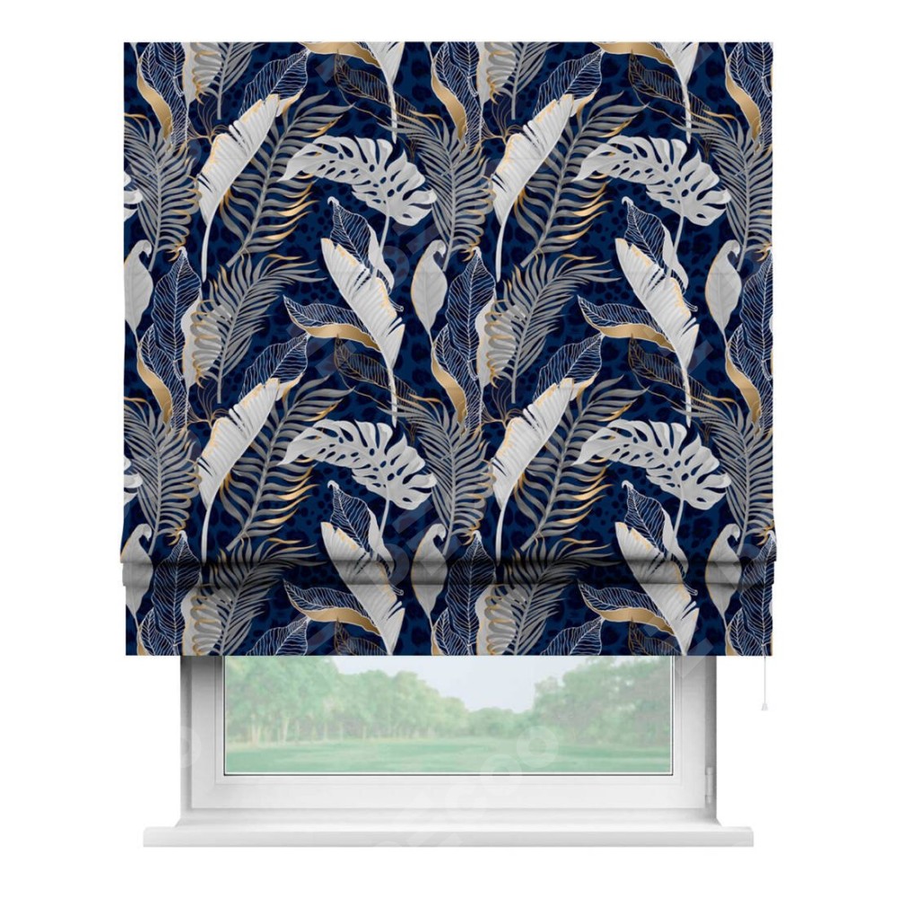 Римская штора производителя «Cortin», используется для проёма, пошита из ткани блэкаут с нанесением сублимационной печати «Сине-золотые джунгли». Имеет универсальный механизм и подходит для монтажа: на потолок, на стену и в нишу.