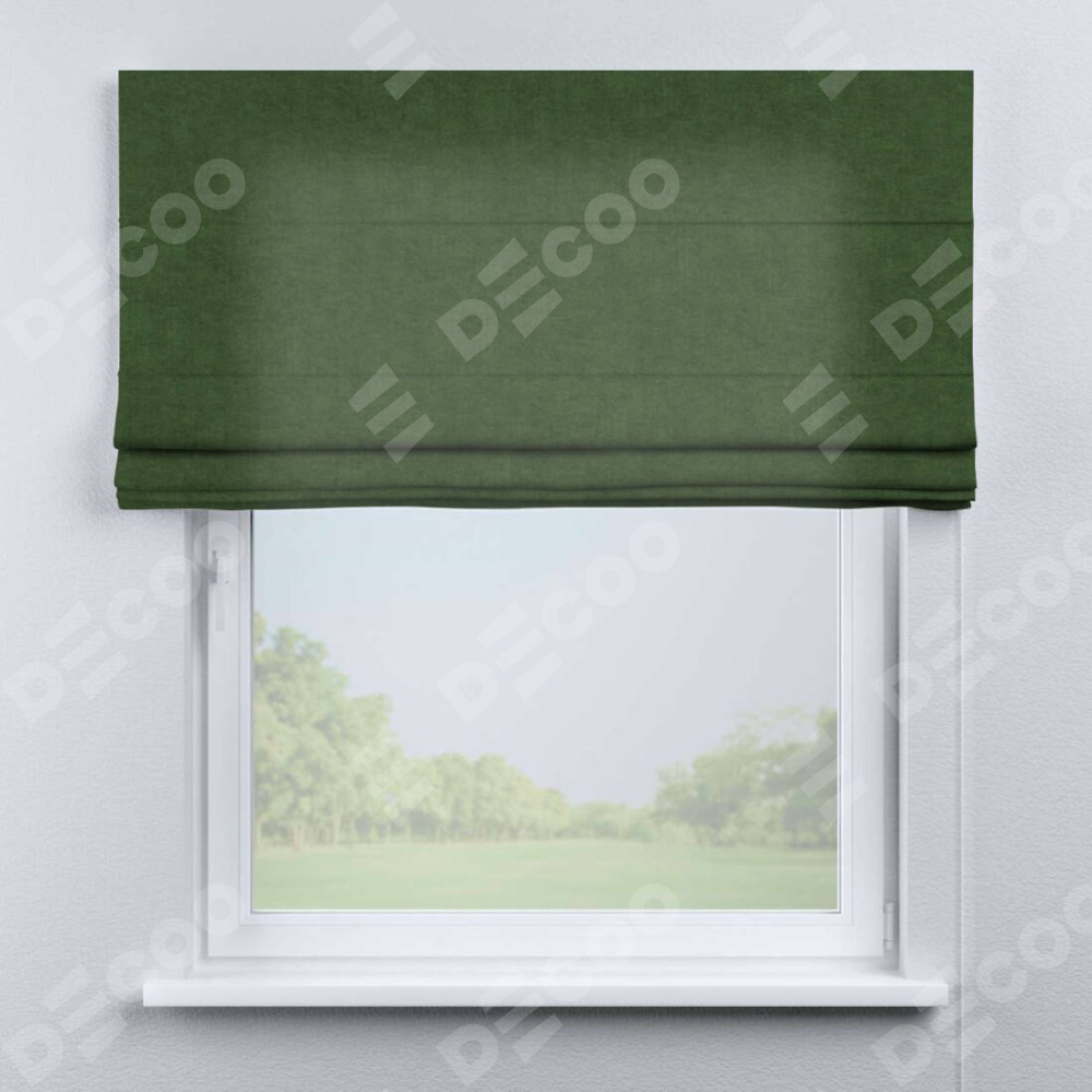 Римская штора производителя «Cortin», используется для проёма, пошита из ткани канвас зелёный, артикул ткани v-16. Имеет универсальный механизм и подходит для монтажа: на потолок, на стену и в нишу.